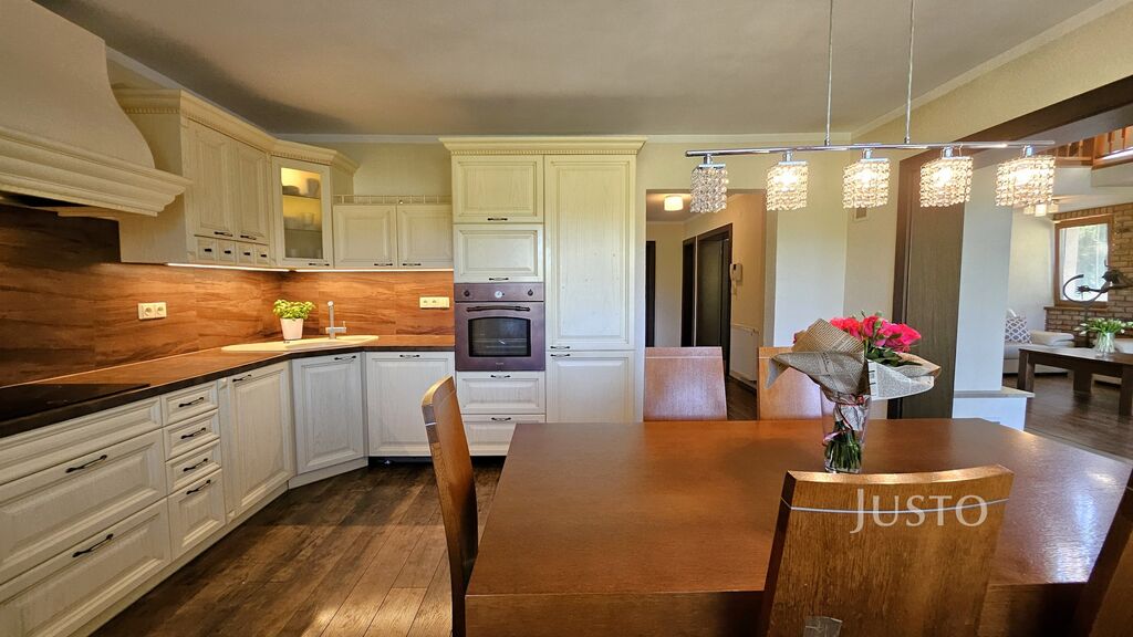 V 1. patře se nachází hlavní obytná část domu. Kuchyně s jídelnou (17 m² ) je laděna do stylu Provence. Dominantou obývacího pokoje (35,1 m²) jsou stylová krbová kamna a otevřená galerie. Z obývacího pokoje lze vyjít přímo na terasu (9,3 m²), dále do zahrady, mj. s pergolou. Dále jsou zde umístěny ložnice (22,4 m²)a dětský pokoj (13,4 m²). Koupelna s vanou, sprchovým koutem a WC (7,1 m²) je zajištěna přímým odvětráním a denním světlem.