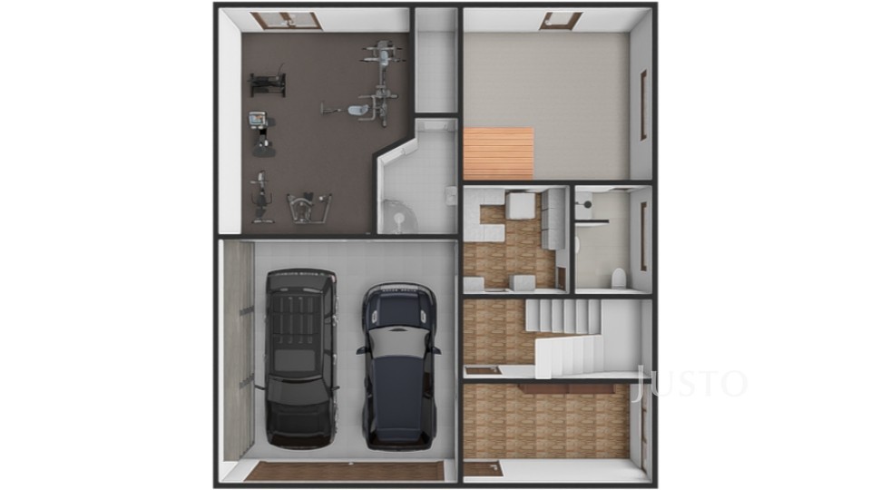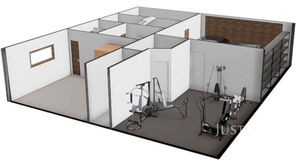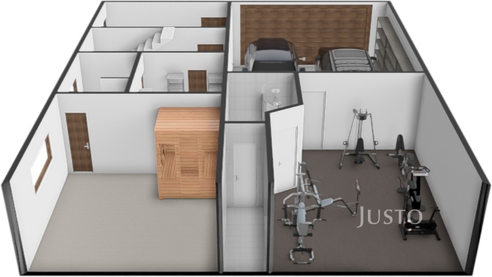 V přízemí se nachází velkorysá vstupní hala (12,3 m²), dodává celému interiéru vzdušný ráz. Hala navazuje přímo na garáž (33 m²)pro dva osobní vozy. K dalšímu ev. parkování poslouží zpevněná plocha před garáží. Další části přízemí je posilovna (21,9 m²), místnost se saunou (17,2 m²), která je s vlastním sprchovým koutem a toaletou. Z obou těchto místností lze vyjít na zahradu s bazénem. Místnost se saunou by bylo možné upravit k trvalému bydlení nebo případně k využití pro drobné podnikání. Technická místnost (6,5 m²) tč. slouží jako spíž a úložné prostory.