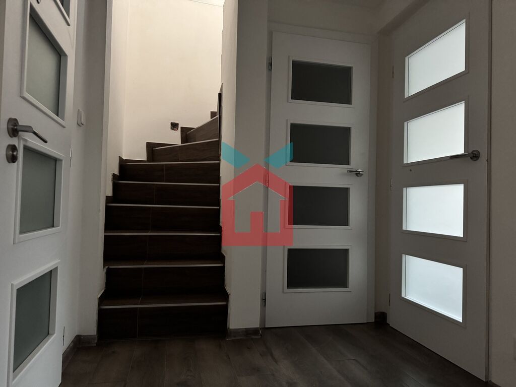 Vstupní chodba na kterou navazuje kuchyně s možností malého obýváku, pokud by někdo potřeboval další dva pokoje v přízemí. Dále je v přízemí koupelna s WC a malý sklep s plynovým kotlem. V mezonetovém patře se nachází obytné podkroví po celé délce domu.