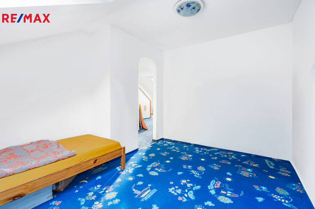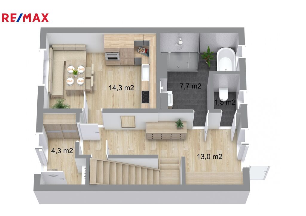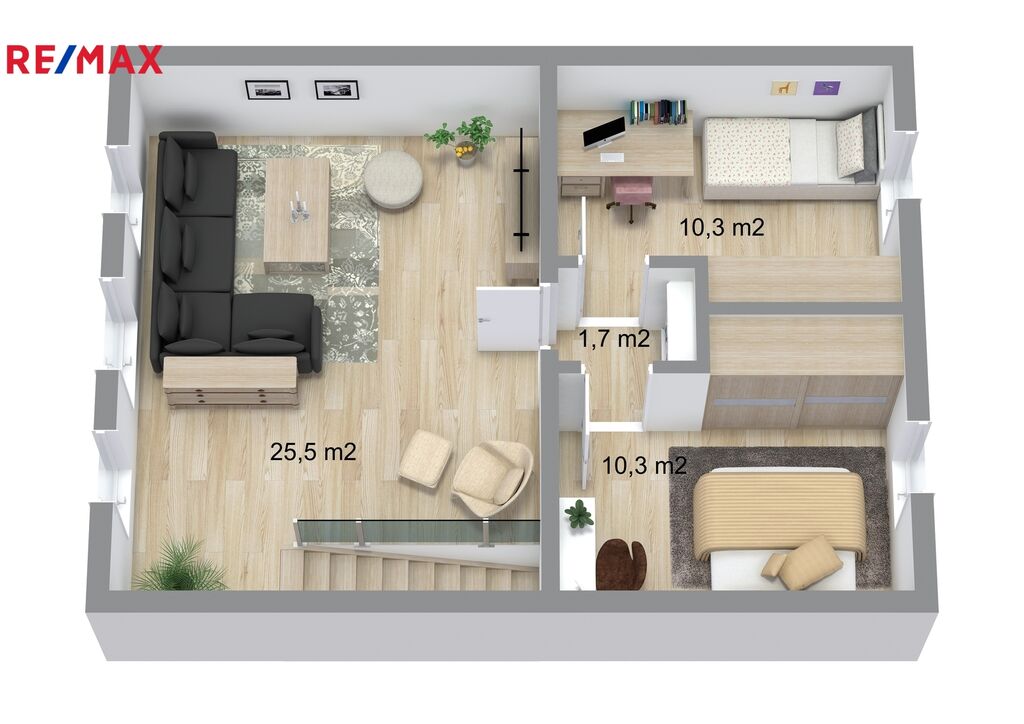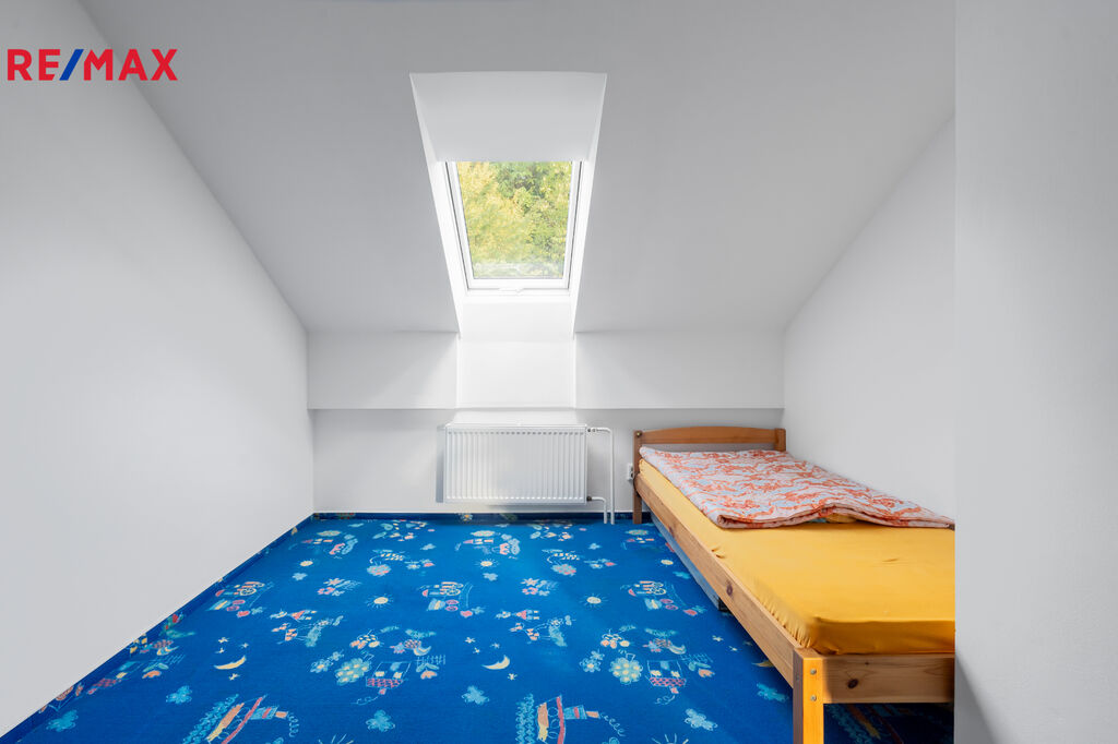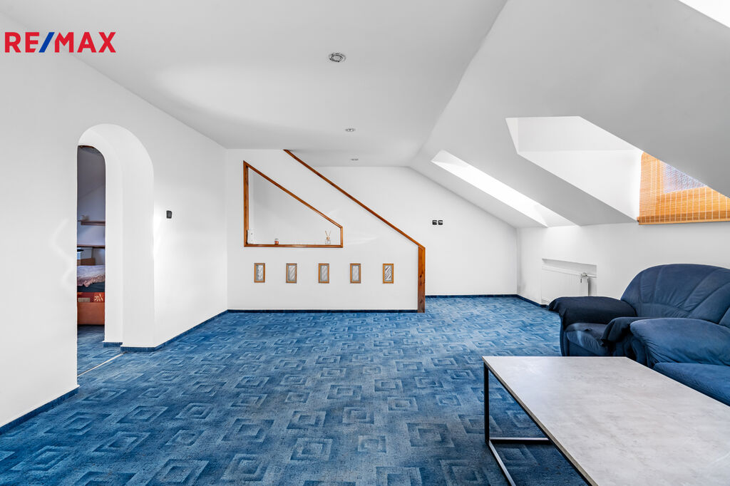 Přes vstupní chodbu je po schodech zpřístupněno obytné podkroví, které tvoří prostorný obývací pokoj a další dva pokoje.