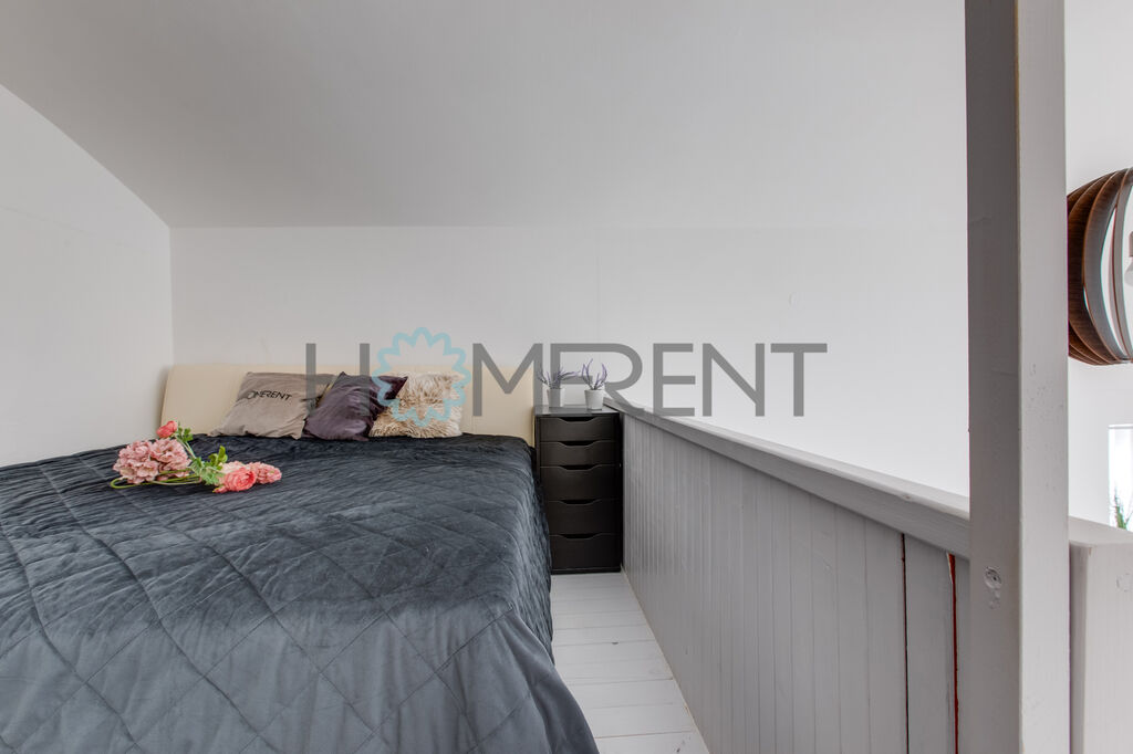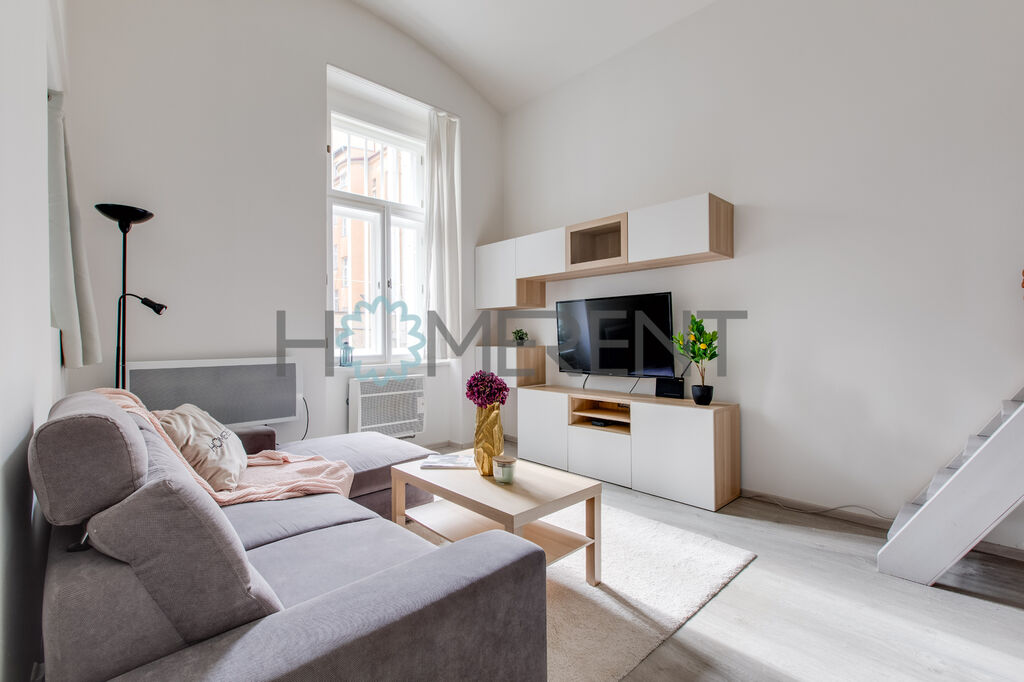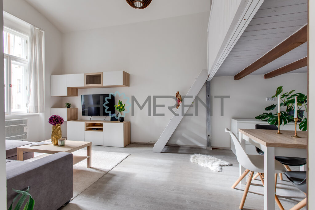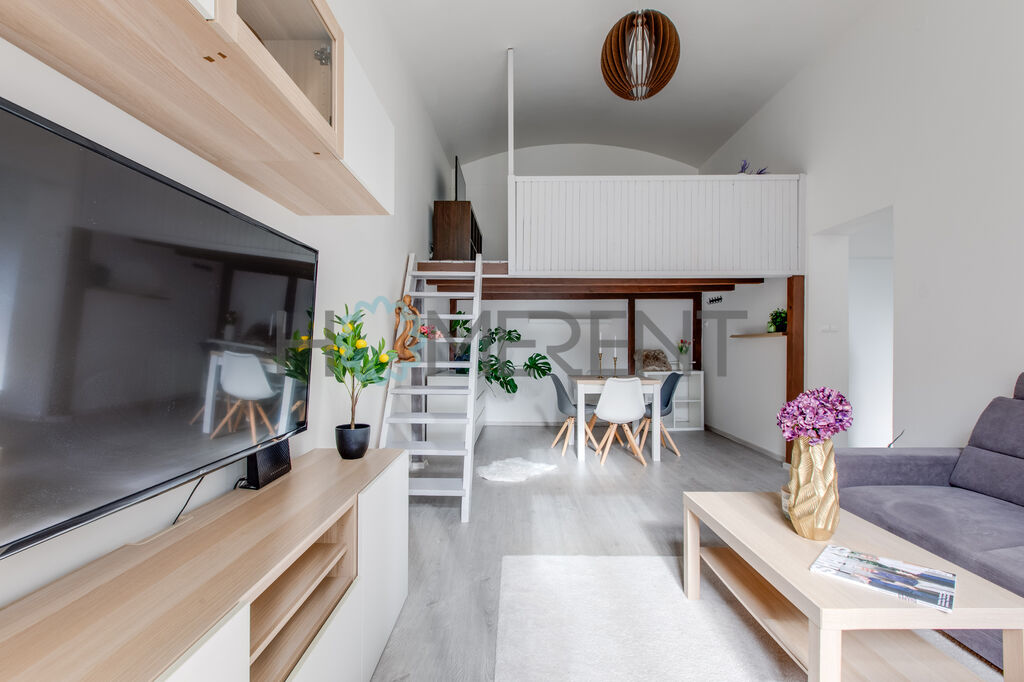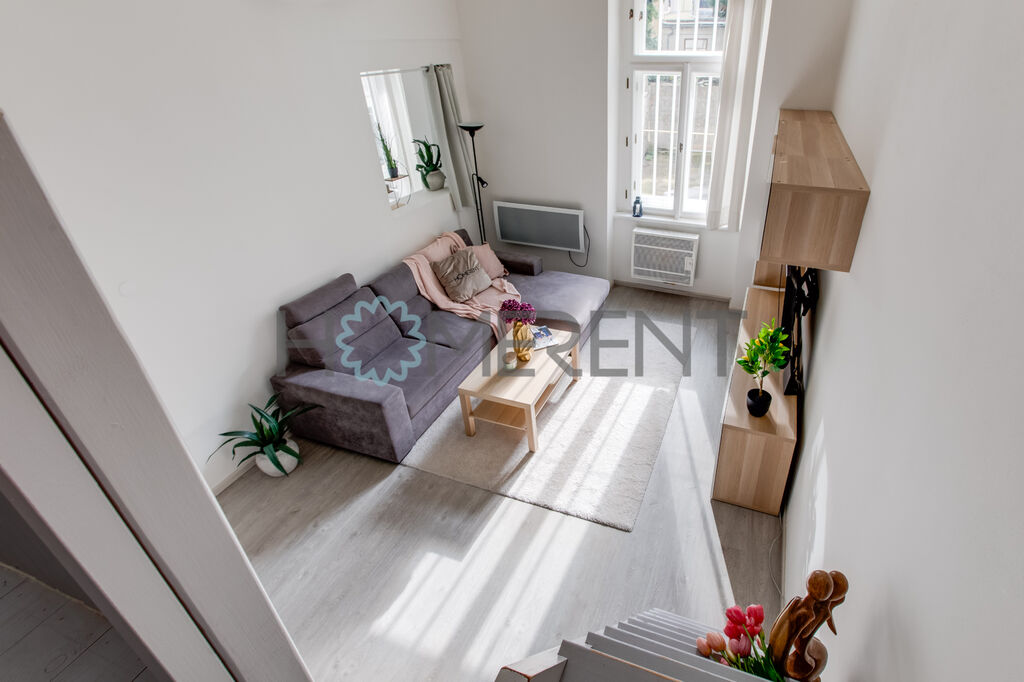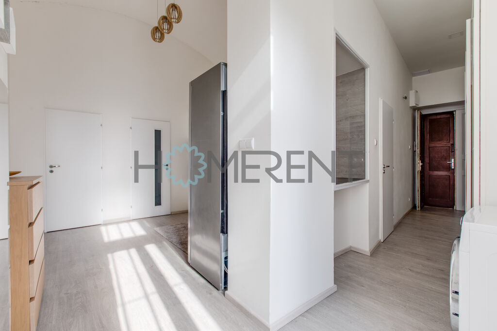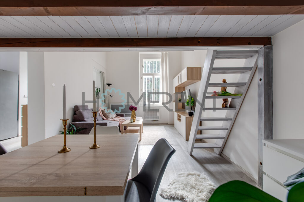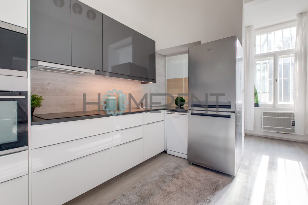 Byt se pyšní impozantními stropy o výšce 5 metrů, díky nimž působí vzdušně a elegantně. Dominantou interiéru je velkorysý obývací prostor s jídelnou a útulným loftovým patrem na spaní, které nabízí dostatek prostoru i pohodlí. Moderní koupelna je navržena s důrazem na design i komfort – nechybí zde dvě umyvadla, prostorný sprchový kout a oddělené WC.