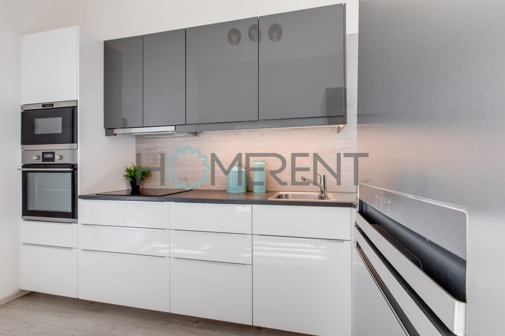 Druhou místnost tvoří samostatná moderní kuchyně, plně vybavená kvalitními spotřebiči a dostatkem úložného prostoru.