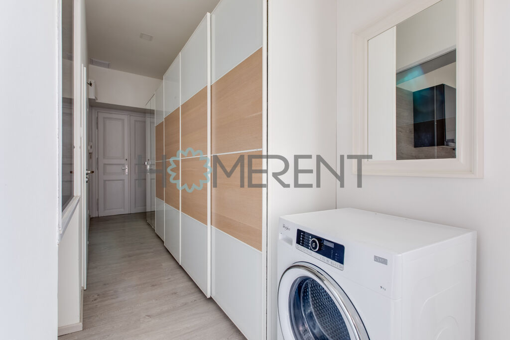 V prostorné chodbě je kombinovaná pračka se sušičkou a praktické vestavěné skříně, které elegantně řeší úložné potřeby.