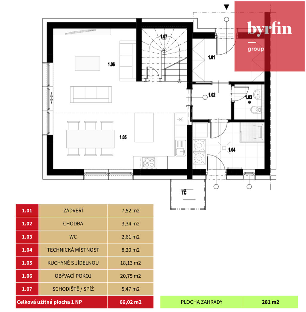 V přízemí se nachází zádveří, technická místnost, samostatné WC a prostorný obývací pokoj s kuchyní a jídelnou, který je propojen se zahradou velkoformátovými HS portálovými dveřmi.
