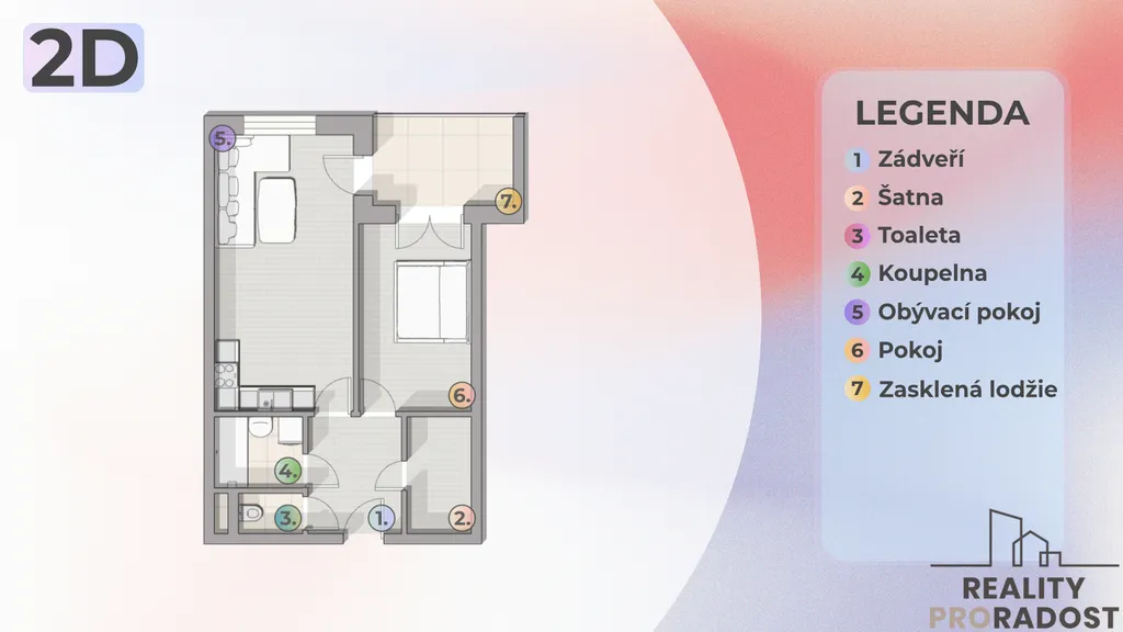 Vstup do bytu vede přes prostorné zádveří, které poskytuje přístup do samostatné šatny, toalety a koupelny s vanou. Dále se z něj dostanete do ložnice a do obývacího pokoje, jenž spojuje jídelní a obývací prostor. Z obývacího pokoje i z ložnice je zajištěn přímý vstup na prostornou, zasklenou lodžii o ploše 7,41 m², která rozšiřuje obytný prostor a nabízí příjemné místo k relaxaci.