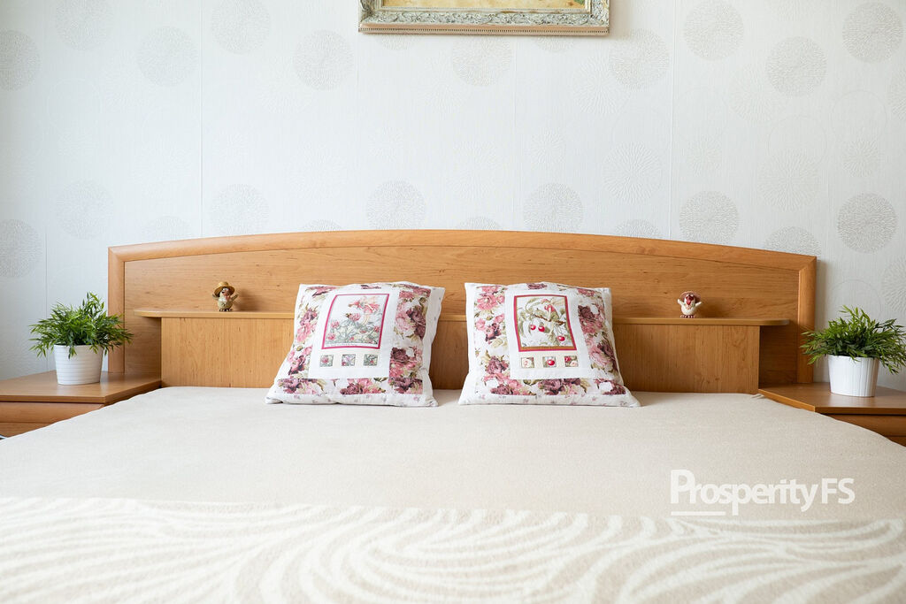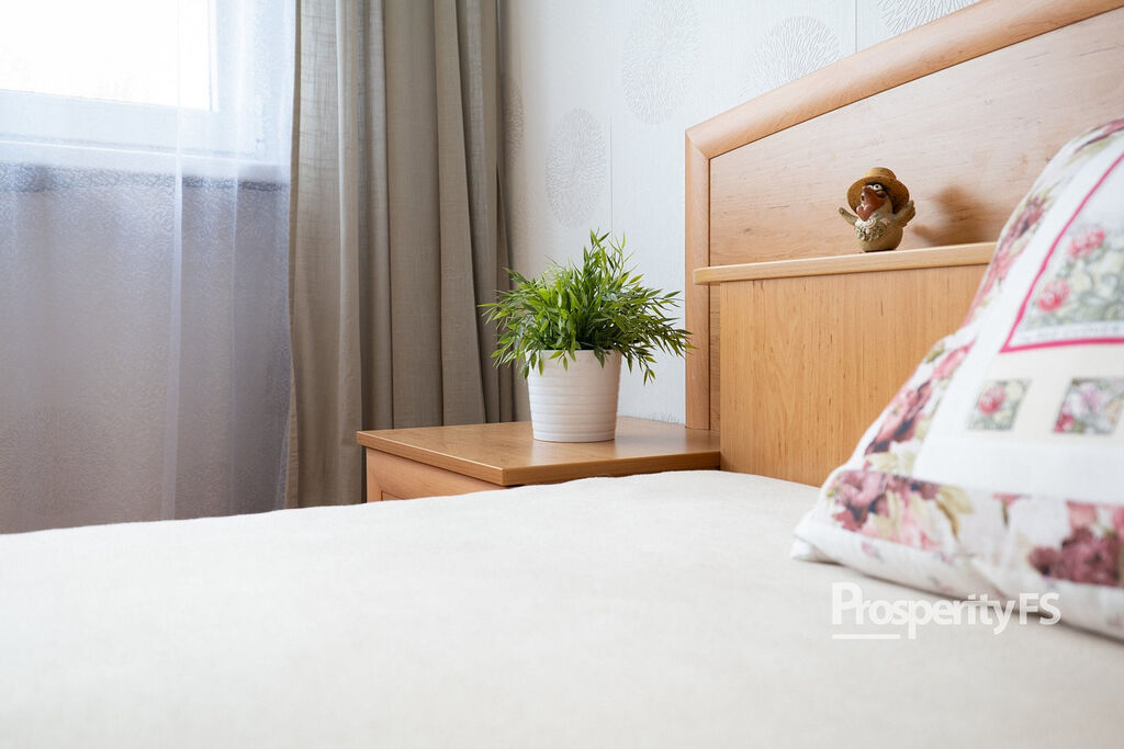 Při vstupu do vzdušné chodby se nabízí prostor k umístění vestavěných skříní, po levé straně pak nacházíme první ložnici, aktuálně sloužící jako pracovna o výměře 10 m² orientovaná na západ. I druhá z ložnic nabízí orientaci na západní stranu, ale výměra ložnice hlavní činí 14 m². Jádro bytu tvoří původní umakartová stěna. Obývací pokoj se samostatnou kuchyní a přímým vchodem na lodžii zajišťují dostatek světla napříč celým dnem.