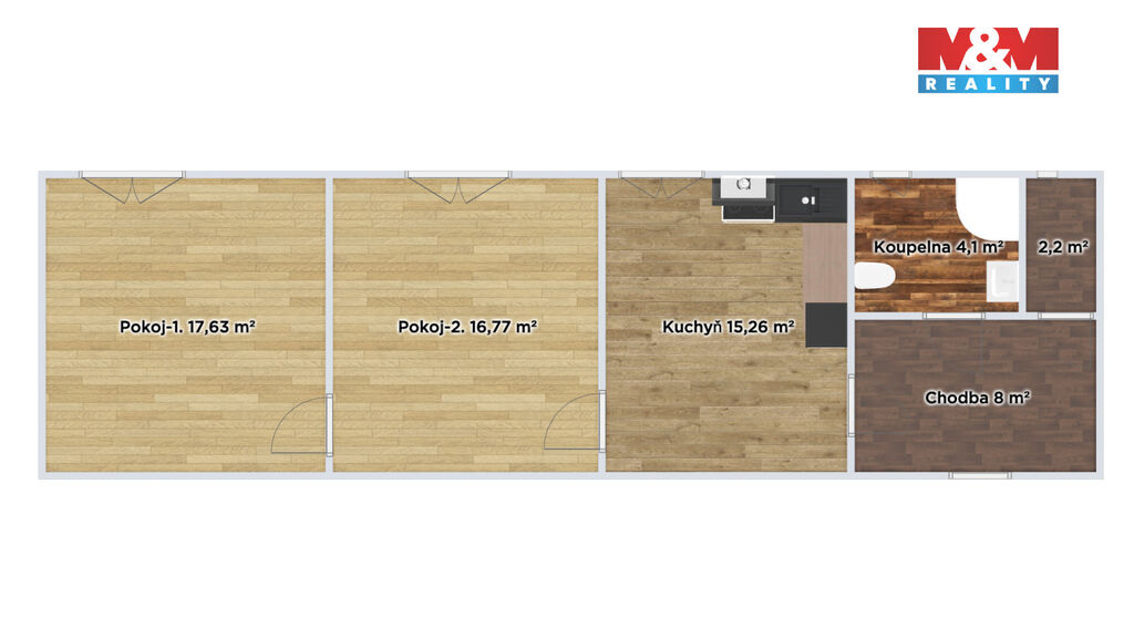 Byt po kompletní rekonstrukci se nachází v 1. patře cihlového domu a jeho užitná plocha činí 64 m².