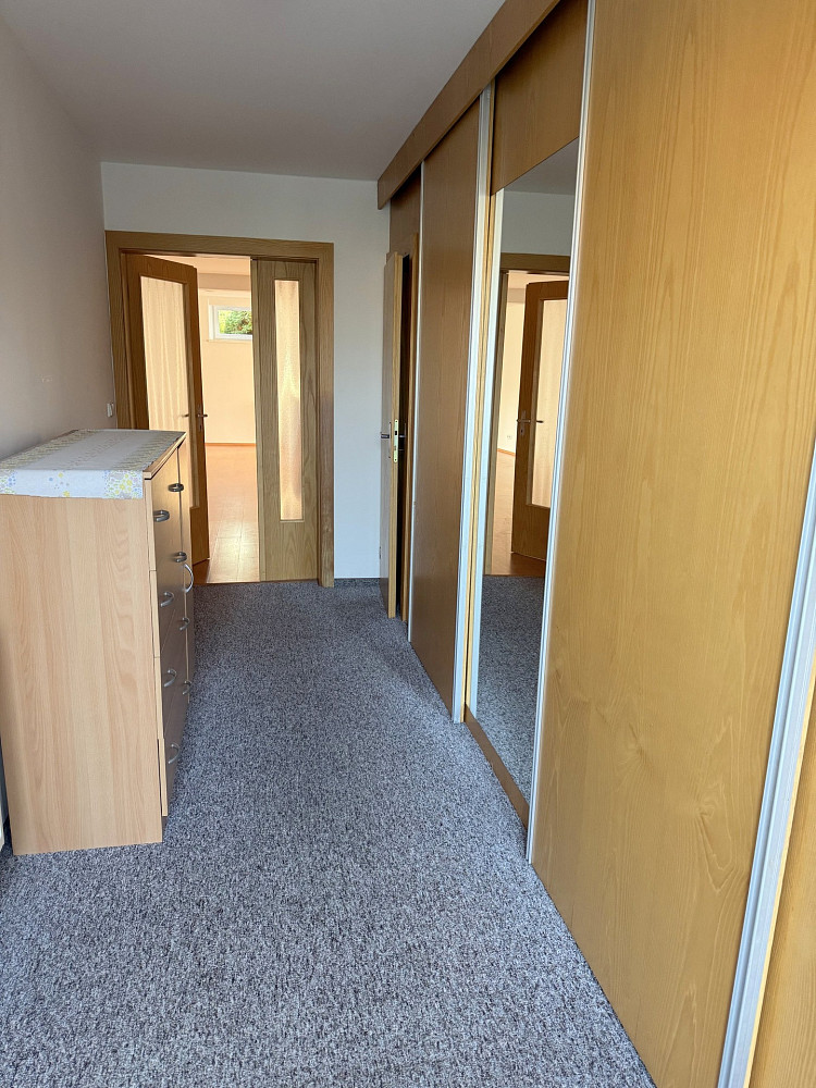 Byt má velký pokoj s kuchyňským koutem, koupelnu s vanou a místem pro pračku i sušičku, samostatné wc a vstupní halu s prostornou šatnou. K bytu náleží terasa s místem pro posezení i prípadně pro menší zahrádku. Parkování přímo u domu.