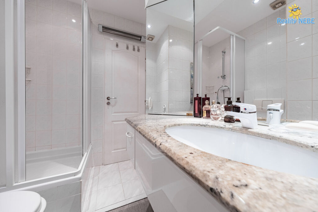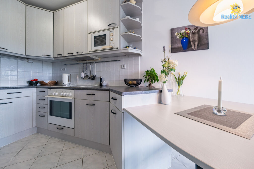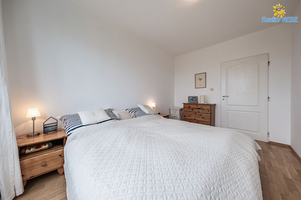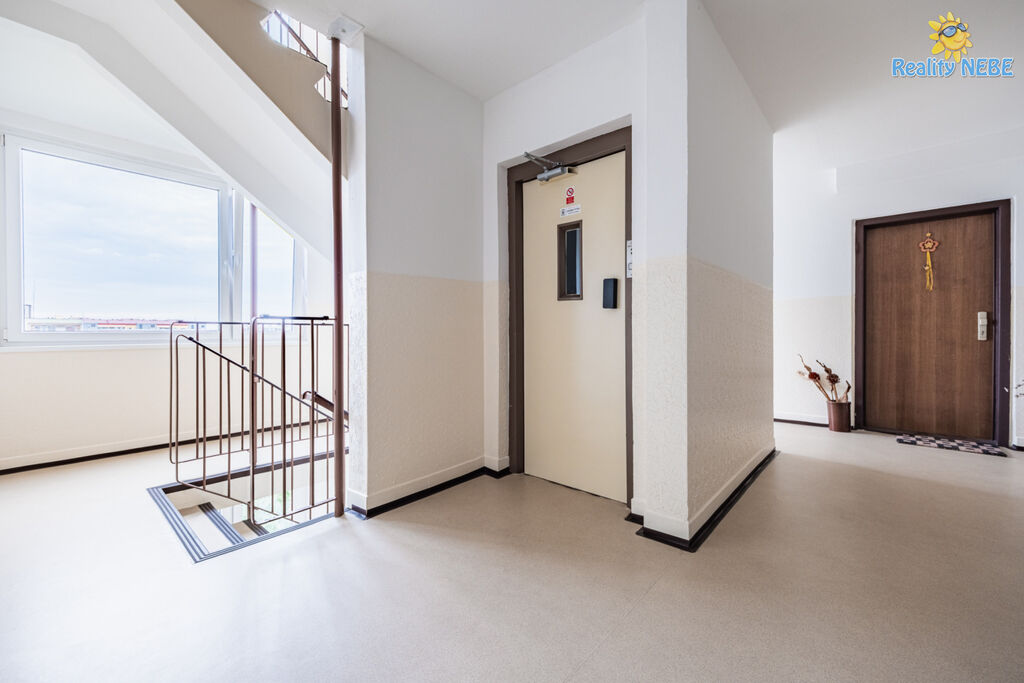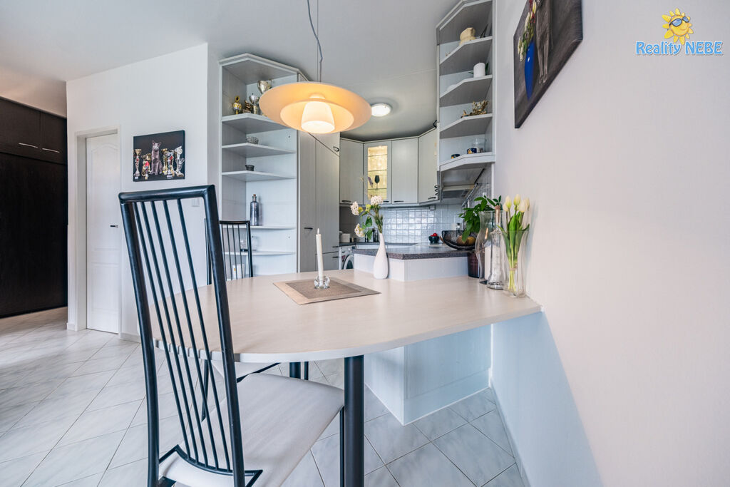 Skládá se ze samostatné ložnice, obývacího pokoje se kuchyňským koutem (linka s vestavnými spotřebiči - lednice s mrazákem, el. varná deska, trouba, digestoř, mikrovlnná trouba, možnost pračky a barovým pultem). Koupelna se sprchovým koutem a WC. Ve vstupní chodbě se nacházejí vestavné šatní skříně, byt má bezpečnostní dveře a náleží k němu sklepní kóje v suterénu domu.