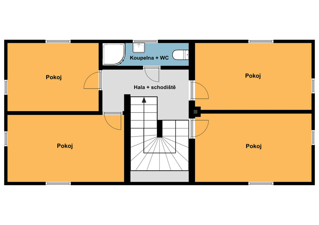 2. nadzemní podlaží: čtyři pokoje a koupelna. Užitná plocha činí 61 m².