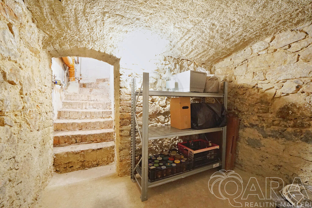Pod domem je kamenný sklep o velikosti 15 m² s klenbovými stropy, suchý a bez známek vlhkosti.
