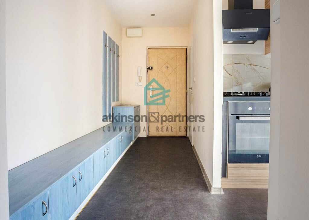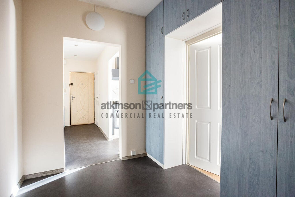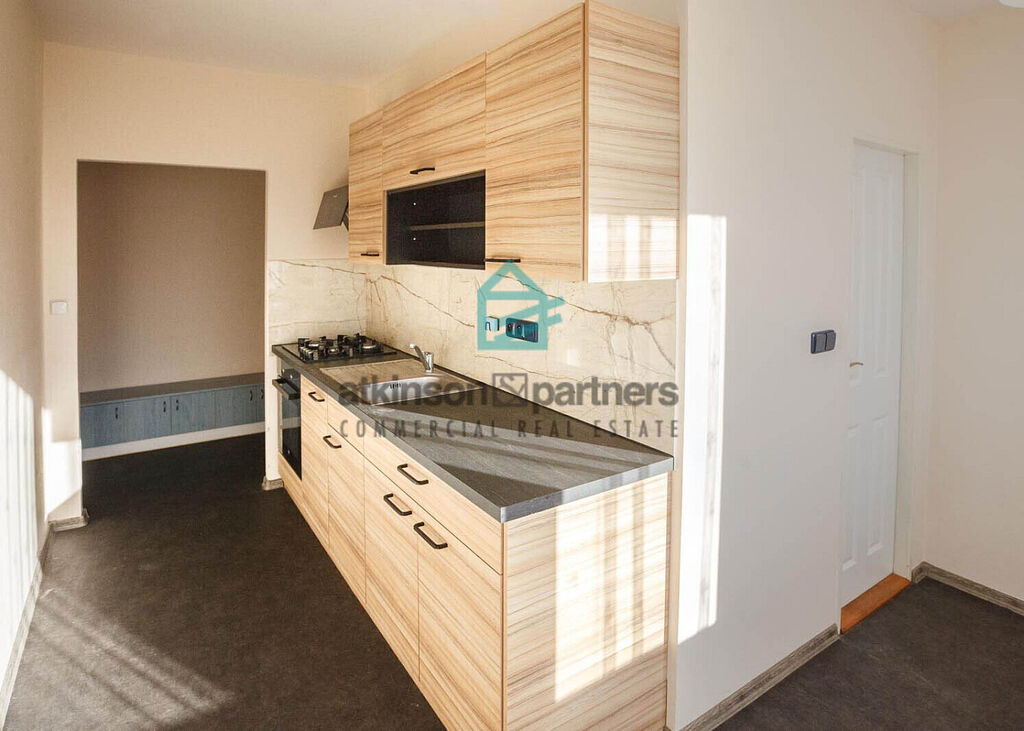 Byt je částečně vybavený – součástí je kuchyňská linka s možností dodání ledničky, pračky a jídelního stolu. V chodbě se nachází prakticky a esteticky řešený vestavěný úložný systém, který nabízí překvapivě velké množství úložného prostoru, a to i pro větší rodinu.