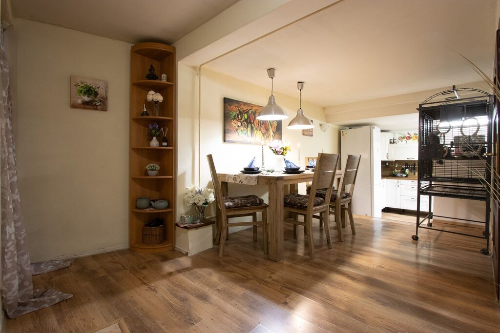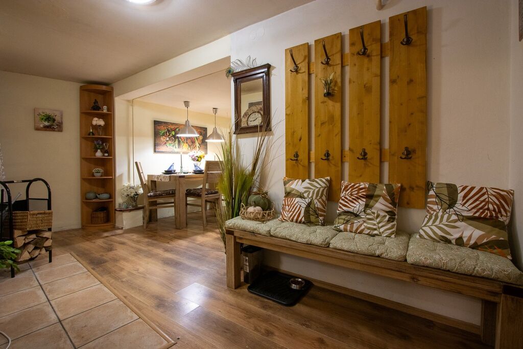 Vstup do domu Vás uvítá slunečnou chodbou, která Vás zavede do prostorného obývacího pokoje s ručně tkaným kobercem a impozantními akvárii, které dotvářejí originální atmosféru prostoru. Krb obložený umělým pískovcem přináší teplo domova a díky průduchům do patra a kombinaci vytápění je docíleno nízkých nákladů na provoz.