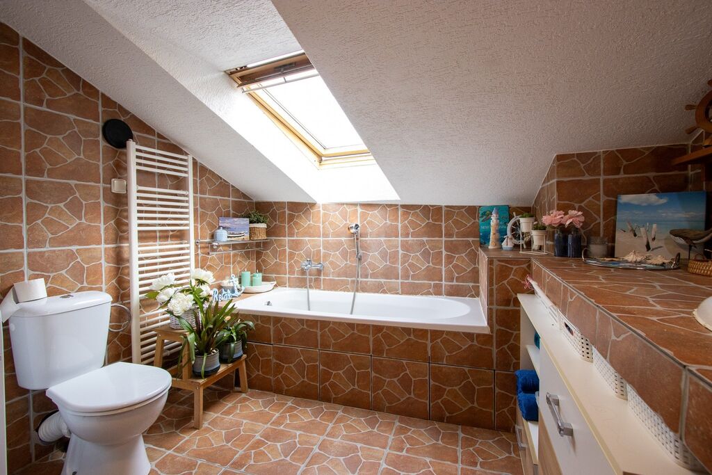 V poschodí, kam vede masivní dřevěné schodiště s mechovým stromovým obrazem, naleznete dva další pokoje a prostornou koupelnu s vanou a WC s podlahovým vytápěním. Kachličky s motivem rezavého kamene přidávají prostoru jedinečný charakter.