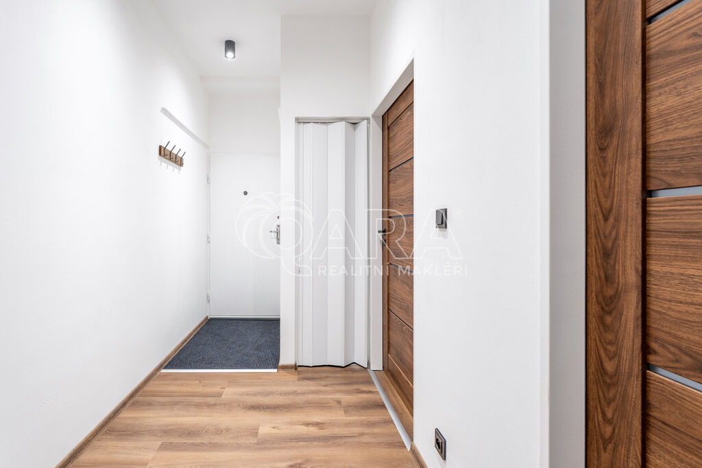 Podlahová plocha bytu je 65 m² a nachází se v 2. NP cihlového domu (výtah je samozřejmostí). Skládá se z předsíně o výměře 6,6 m², ze které jsou přístupné všechny pokoje, které jsou vzájemně neprůchozí. Kuchyně je spojená s jídelnou a je zařízena novou kuchyňskou linkou s lednicí s mrazákem, elektrickou troubou, dvouplotýnkovou indukční varnou deskou, digestoří i myčkou. Z kuchyně je vstup do lodžie o výměře 1,7 m². Dále jsou k dispozici dva pokoje, první o výměře 20,6 m² a druhý o výměře 19,6 m². Z chodby je přístupná také technická místnost o výměře 0,6 m². Koupelna je vybavena sprchovým koutem, umyvadlem i pračkou. WC je samostatně. Součástí je také sklepní kóje v přízemí domu.