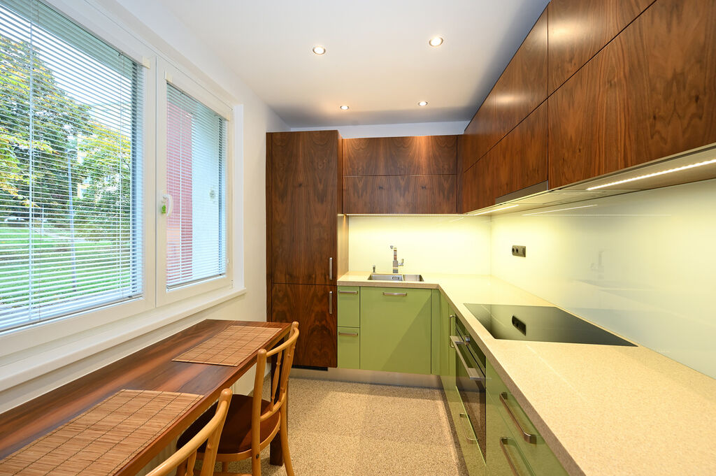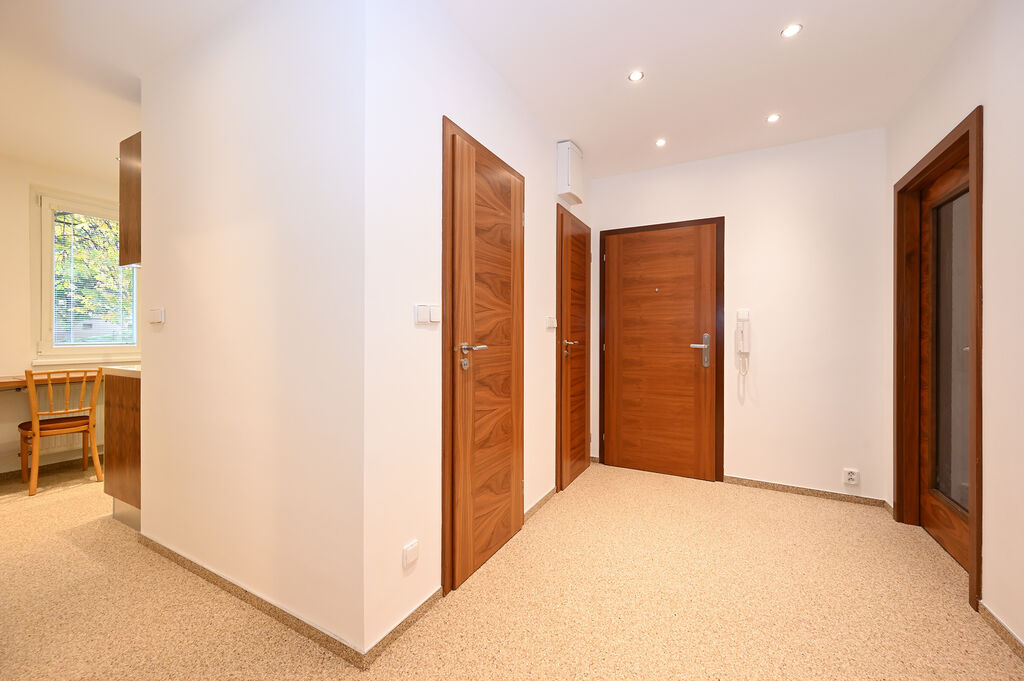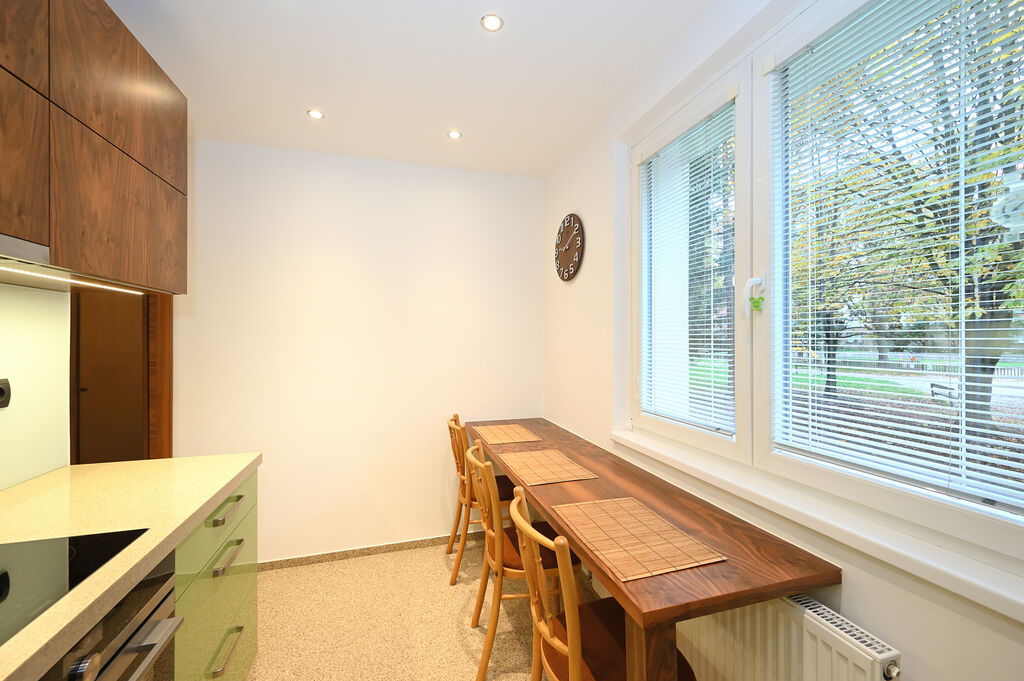 Byt prošel kompletní a kvalitní rekonstrukcí ve vysokém standardu, která zahrnuje dřevěné podlahy, moderní koupelnu se sprchovým koutem a oddělenou toaletu. Orientace bytu zajišťuje naprostý klid, z jedné strany je výhled do tichého vnitrobloku se vzrostlými stromy a dětským hřištěm, parkování je možné přímo před domem.