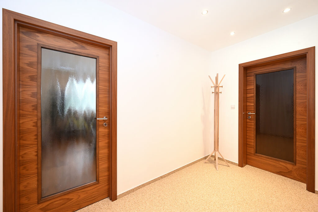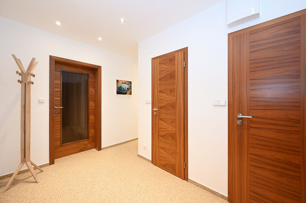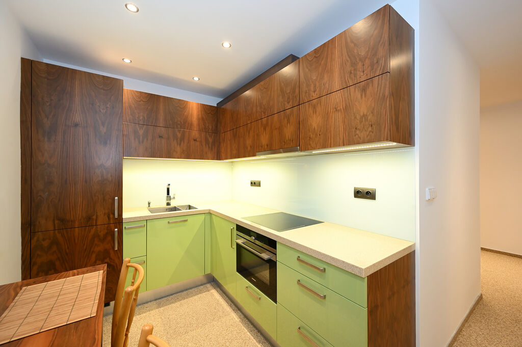 Dispozici tvoří vstupní chodba, prostorný obývací pokoj s klimatizační jednotkou a vstupem na zasklenou lodžii s elektrickým stíněním. Dále zde najdete dva samostatné pokoje, které lze využít jako ložnici a dětský pokoj, případně jako pracovnu. V současnosti je jedna z nich zařízena postelí, vestavěnou skříní z masivního dřeva a televizí, druhá pak velkou rozkládací sedací soupravou, dřevěným konferenčním stolkem a moderní úložnou sestavou doplněnou audio systémem. Kuchyně je samostatná a kompletně vybavená, její součástí je kombinovaná elektrická trouba s mikrovlnkou, sklokeramická varná deska, digestoř, pračka a vestavěná lednice s mrazákem (bez myčky).