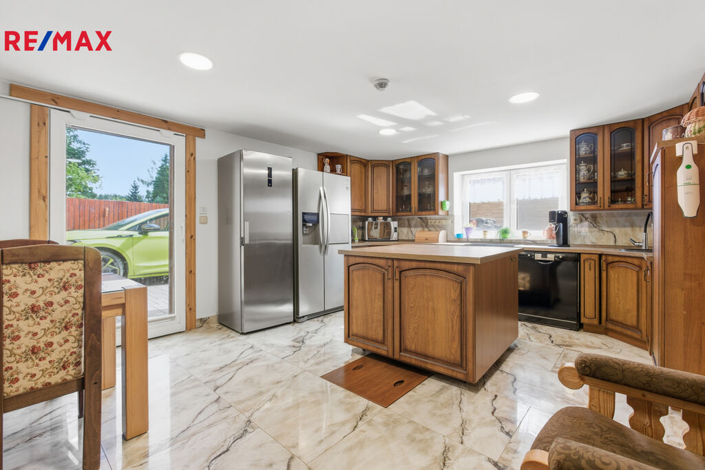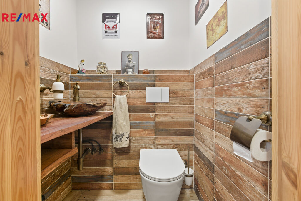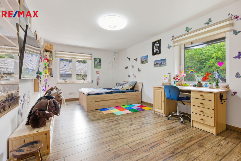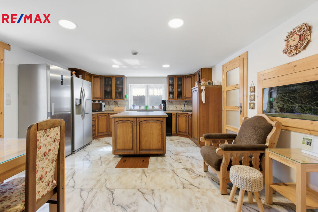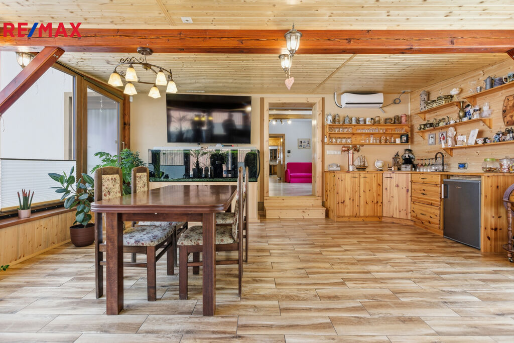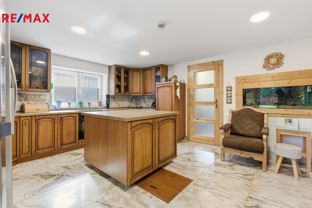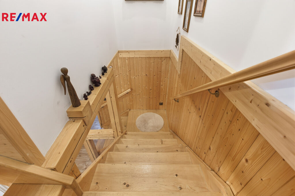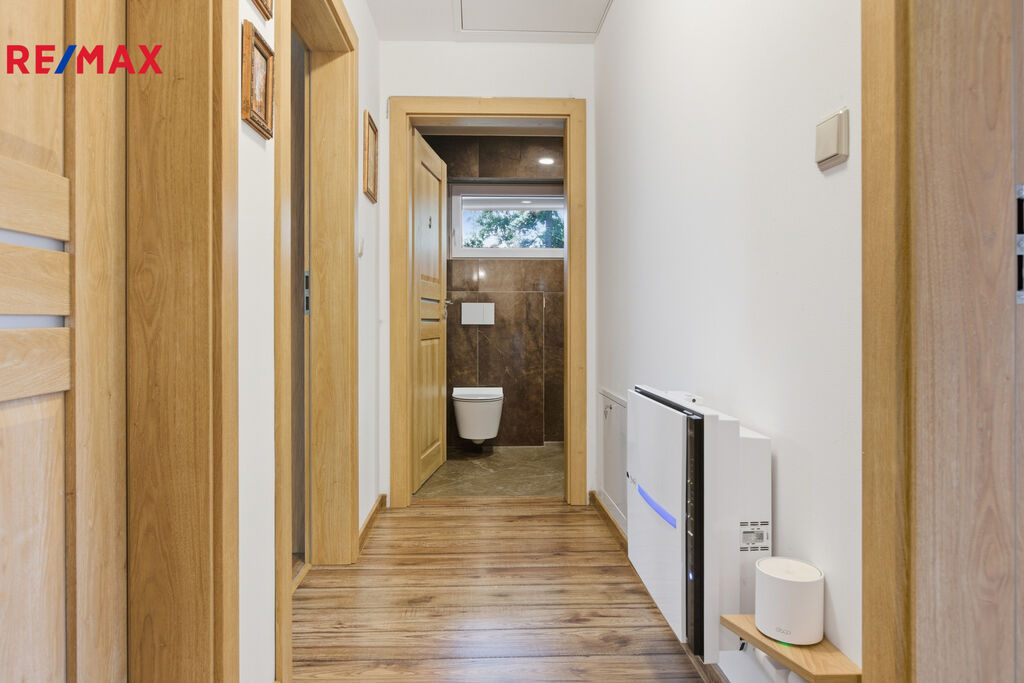 Interiér domu je laděný v přírodním stylu – dřevo dominuje podlahám, stropům i vestavěnému nábytku. První patro nabízí pracovnu, moderní koupelnu s WC, kuchyň, která důmyslně ukrývá pod posunovacím ostrůvkem sklep o velikosti 6m2 (zajištěno odvětrávání-cirkulace vzduchu), hernu pro děti, prostorný obývací prostor s jídelnou a kuchyní v otevřeném konceptu, technické zázemí a garáž.  Kuchyňská linka na míru, bohaté úložné prostory, rustikální doplňky, krbová kamna a velké akvárium pod televizí tvoří jedinečnou atmosféru. Ve druhém patře najdeme několik ložnic a koupelnu s WC. Schodiště a detaily z masivu vytváří útulný, ale zároveň reprezentativní vzhled. Nad garáží je prostorná půda (cca 40m2) a nad domem také (cca 80m2), na kterou je přivedené topení což nabízí další možnost vybudovat podkrovní pokoje. Dům je moderně vybavený co se tyká ovládání. Má kamerový systém kolem celého domu a je napojen na bezpečnostní firmu Jablotron. Video telefon připojeny i ke vzdálenému přihlášení. Elektronické venkovní rolety představují moderní a efektivní řešení pro stínění, zabezpečení a tepelnou izolaci oken. Díky elektrickému pohonu a možnosti automatizace poskytnou maximální komfort a ochranu. Navíc přispívají ke snížení energetických nákladů.