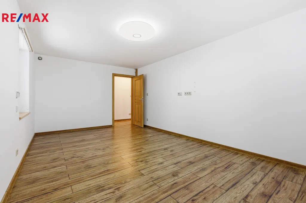 Interiér domu je laděný v přírodním stylu – dřevo dominuje podlahám, stropům i vestavěnému nábytku. První patro nabízí pracovnu, moderní koupelnu s WC, kuchyň, která důmyslně ukrývá pod posunovacím ostrůvkem sklep o velikosti 6m2 (zajištěno odvětrávání-cirkulace vzduchu), hernu pro děti, prostorný obývací prostor s jídelnou a kuchyní v otevřeném konceptu, technické zázemí a garáž. Kuchyňská linka na míru, bohaté úložné prostory, rustikální doplňky, krbová kamna a velké akvárium pod televizí tvoří jedinečnou atmosféru. Ve druhém patře najdeme několik ložnic a koupelnu s WC. Schodiště a detaily z masivu vytváří útulný, ale zároveň reprezentativní vzhled. Nad garáží je prostorná půda (cca 40m2) a nad domem také (cca 80m2), na kterou je přivedené topení což nabízí další možnost vybudovat podkrovní pokoje. Dům je moderně vybavený co se tyká ovládání. Má kamerový systém kolem celého domu a je napojen na bezpečnostní firmu Jablotron. Video telefon připojeny i ke vzdálenému přihlášení. Elektronické venkovní rolety představují moderní a efektivní řešení pro stínění, zabezpečení a tepelnou izolaci oken. Díky elektrickému pohonu a možnosti automatizace poskytnou maximální komfort a ochranu. Navíc přispívají ke snížení energetických nákladů.
