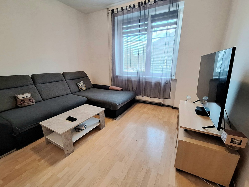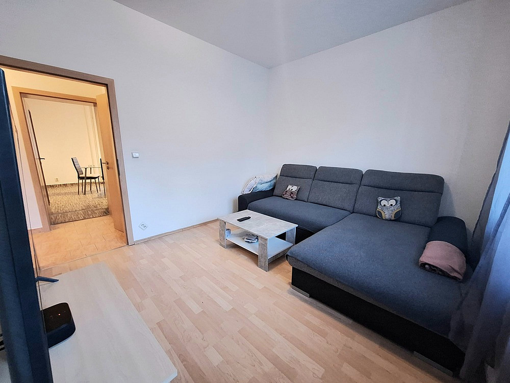 Dispozice – pokoj s kuchyňským koutem velikosti 17 m², dva neprůchozí pokoje 13 m² a 7 m², předsíň, koupelna se sprchovým koutem společně s WC, v suterénu k dispozici sklep a prádelna s možností zapojení vlastní pračky i sušičky se samostatným měřičem elektřiny a vody).