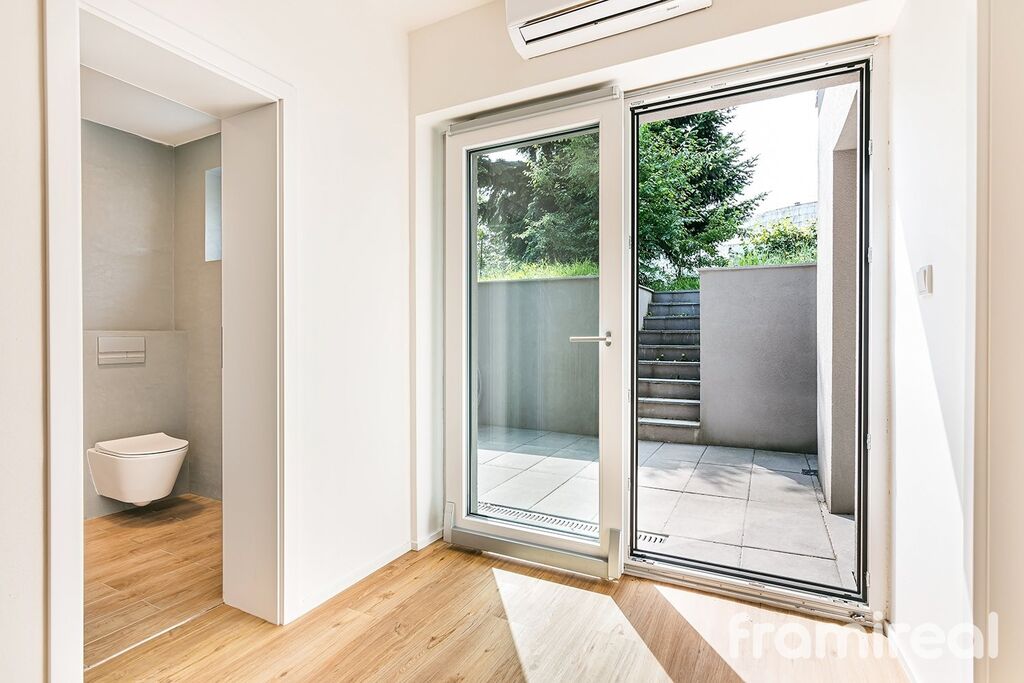 Objekt se nachází za hlavní budovou a přístup k němu vede přes její zázemí. Díky tomu je bydlení příjemně oddělené, s dostatkem soukromí a minimem ruchu z ulice. Užitná plocha domu činí 58 m² a jeho dispozice zahrnuje obývací pokoj s kuchyňským koutem a vstupem na terasu, ložnici, pracovnu s dalším venkovním vstupem a koupelnu s vanou, sprchovým koutem a toaletou. V obývacím prostoru je instalována klimatizace, v celém domě je podlahové vytápění a kvalitní vinylová podlaha. Okna jsou osazena trojskly, která pomáhají udržet stabilní teplotu a klid v interiéru.