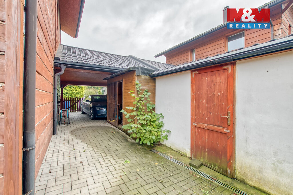 U domu stání pro 2 auta a přístřešek pro 1 auto. Pro psa je připraven kotec.