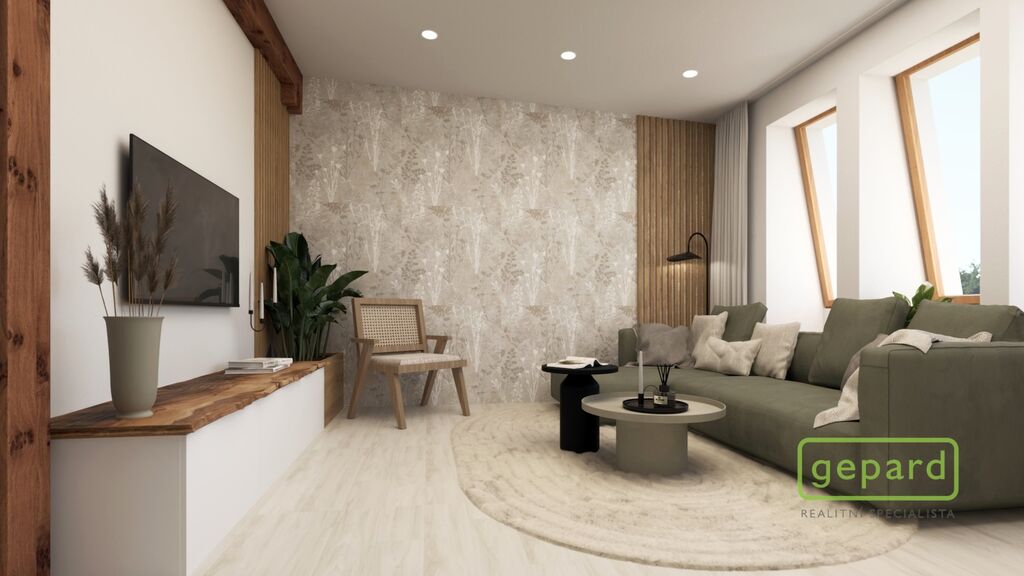 Byt má vysoké stropy s přiznanými trámy, přirozené světlo a naprosto jedinečnou atmosféru.