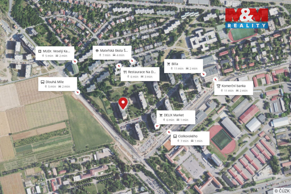 Lokalita je velmi atraktivní – tramvajová i autobusová zastávka jsou jen pár minut chůze od domu, v blízkosti se nachází také OC Šestka s veškerou občanskou vybaveností. Výborná dopravní dostupnost do centra i na letiště dělá z tohoto bytu ideální místo pro rodinu, pár i jednotlivce.