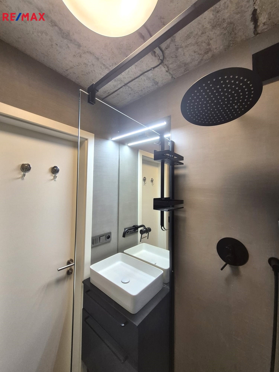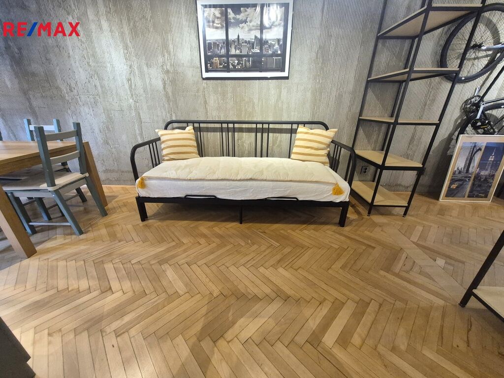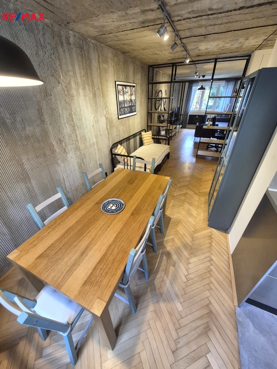 Nabízíme k pronájmu jedinečný byt 2+kk (původně 4+1), o podlahové ploše cca 73 m2 + lodžie 4 m2 , v 1. nadzemním podlaží bytového domu v pražských Záběhlicích, který prošel promyšlenou rekonstrukcí a nabízí originální atmosféru industriálního stylu. Úpravou dispozice vznikl vzdušný, otevřený prostor s podlahovou plochou cca 41 m², propojující kuchyň, jídelnu a obývací část. Jednotlivé části jsou pouze opticky rozděleny a navazují na předsíň. Kuchyňská linka je plně vybavena: plynová varná deska, elektrická trouba, myčka, lednice s mrazákem a pračka se sušičkou. Z otevřené předsíně je vstup do koupelny se sprchovým koutem a samostatné toalety. Ložnice o velikosti cca 23 m² nabízí 7 vestavných skříní a přímý vstup na zasklenou lodžii. Další úložné prostory zajišťuje vestavná skříň v předsíni. Orientace bytu na západ (kuchyň, jídelna) a východ (obývací část, ložnice, lodžie) zajišťuje dostatek denního světla po celý den.