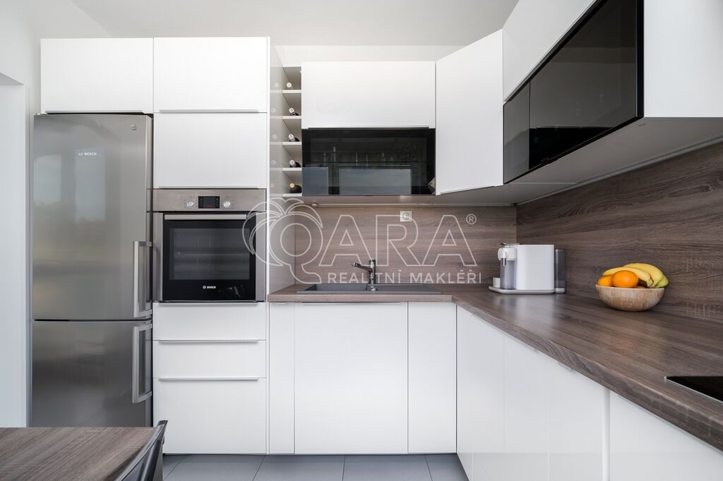 V kuchyni budete moci využívat kvalitní spotřebiče jako elektrickou troubu, indukční varnou desku, myčku, lednici s mrazákem vše zn. Bosch a digestoř zn. Elica. Ve všech pokojích jsou položeny plovoucí podlahy, v kuchyni, na chodbě, koupelně, WC a komoře je dlažba. V celém bytě jsou plastová okna, v obývacím pokoji jsou navíc osazena venkovními roletami s elektrickým pohonem. Ve všech místnostech jsou vyměněny topná tělesa za nová. Instalovány jsou bezpečnostní vstupní dveře zn. Sherlock. Zcela jistě oceníte i moderní zpracování koupelny a samostatné WC. Relaxovat u kávy budete moci na novém balkoně o velikosti 6 m2. Balkon s nádherným výhledem je i kompletně zasklený.