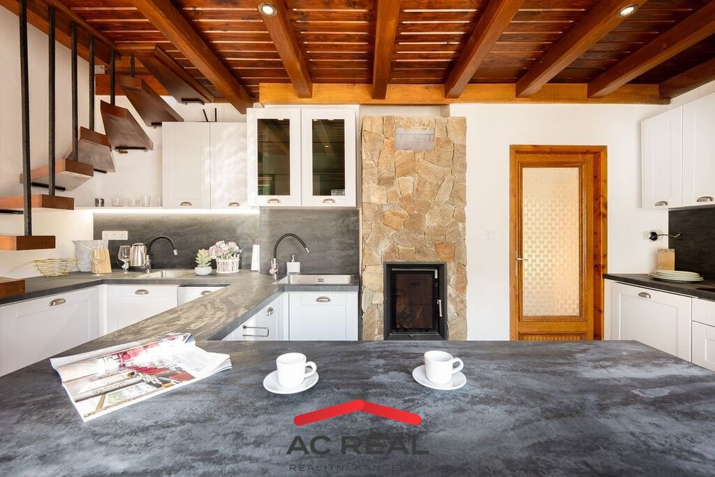 Hlavní zóna klidu: obývací pokoj a prostorná obytná kuchyně s novým krbem. Obě místnosti s přímým vstupem na velkou terasu. Ráno káva, večer víno a příroda na dosah.