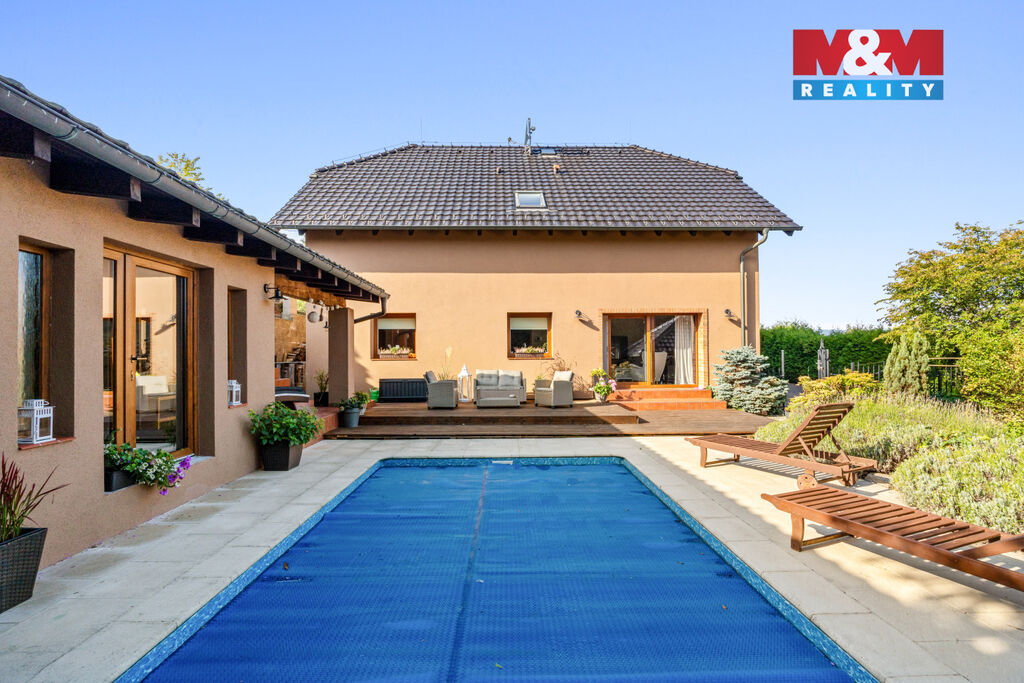 Sníte-li o bydlení v klidné a lukrativní lokalitě, tak Vás zveme do vyhledávané obce Chuderov do exkluzivního rodinného domu o zastavěné ploše 157 m2 na pozemku o rozloze 848 m² s výhledem do krásného okolí. Hlavní obývací část v přízemí zahrnuje plně vybavenou kuchyň se spižírnou, vstup na terasu, odkud se Vám otevře výhled na zahradu s jezírkem, pergolu s grilem, krbem, bazénem, solární sprchou a velkým bonusem je sauna, bar, kuchyňka, sprcha a WC v samostatné stavbě. Z předsíně jsou samostatné vstupy do pokoje, koupelny se sprchovým koutem a WC, technické místnosti, skladu a garáže. Ve druhém podlaží naleznete čtyři neprůchozí pokoje, koupelnu s vanou a samostatným WC. Velká půda vybízí k vybudování dalších obytných prostor. Dům se střešní krytinou - glazovaný Tondach, je vybaven moderními technologiemi jako podlahové topení, klimatizace a centrální vysavač, vnitřní a venkovní rolety, kazetové dveře a vlastní čistička. Přijďte se určitě podívat. Těšit se na Vás bude Bohuš a Zuzka