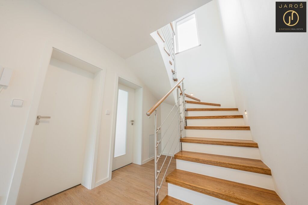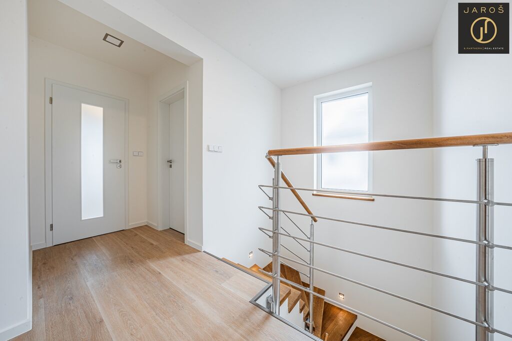Vinylové podlahy, schody a madla z tvrdého dřeva, nerezové zábradlí. Interiérové dveře značky SAPELI.
