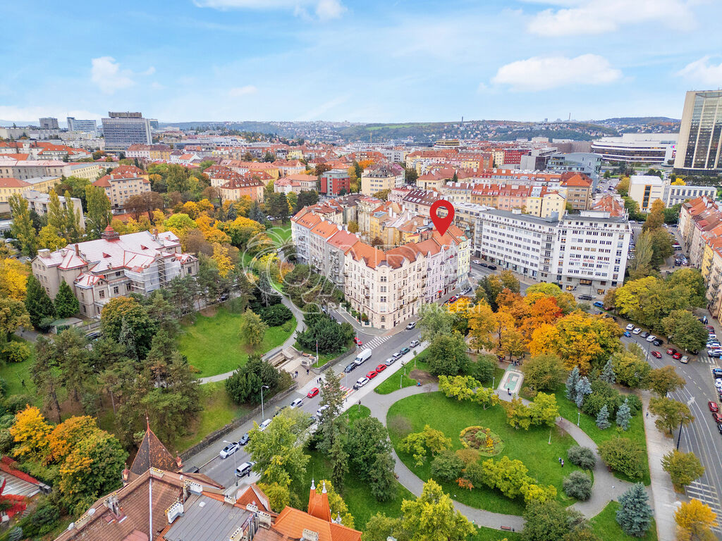 Ve druhém podlaží cihlového domu najdete prostor, který si zachoval charakter staré Prahy – vysoké stropy, dřevěná okna a výhled do zeleného vnitrobloku, kam mají přístup všichni obyvatelé domu. Místo, kde se dá na chvíli zpomalit a nadechnout.