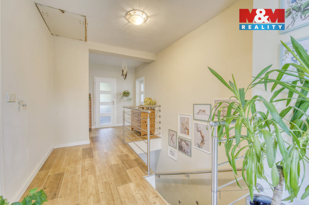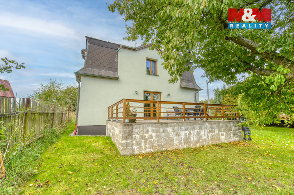 Dominantou domu je velká zděná terasa s nádhernými výhledy do okolní zeleně – ideální místo pro ranní kávu, rodinné večeře nebo večerní relax.