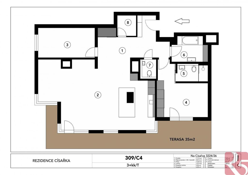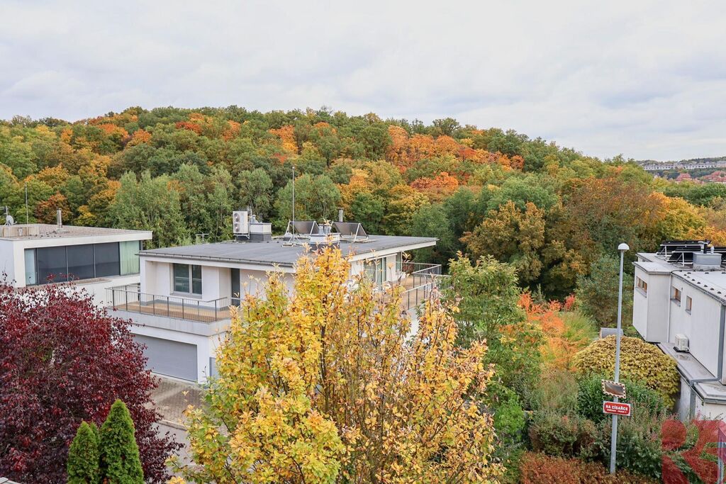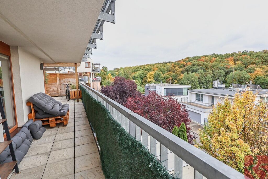 Prostorný byt se 2 koupelnami, jižně orientovanou, 35 m2 terasou a krásnými výhledy do okolní zeleně, situovaný ve 3. patře moderní budovy, která je součástí rezidenčního komplexu s 24/7 recepcí a ostrahou, kamerovým systémem a dětským hřištěm.