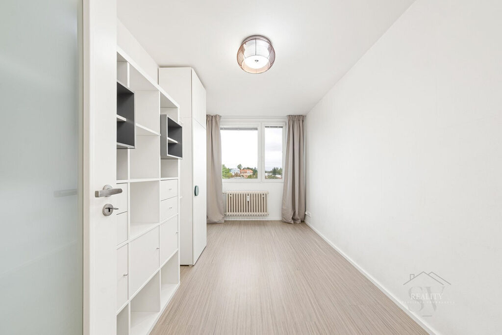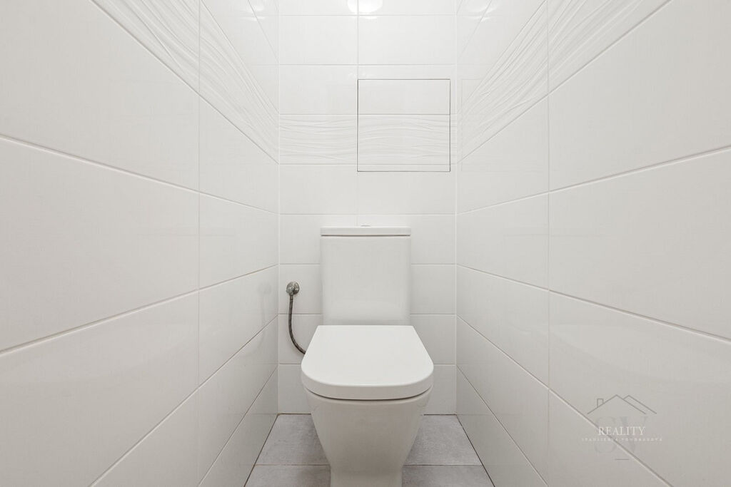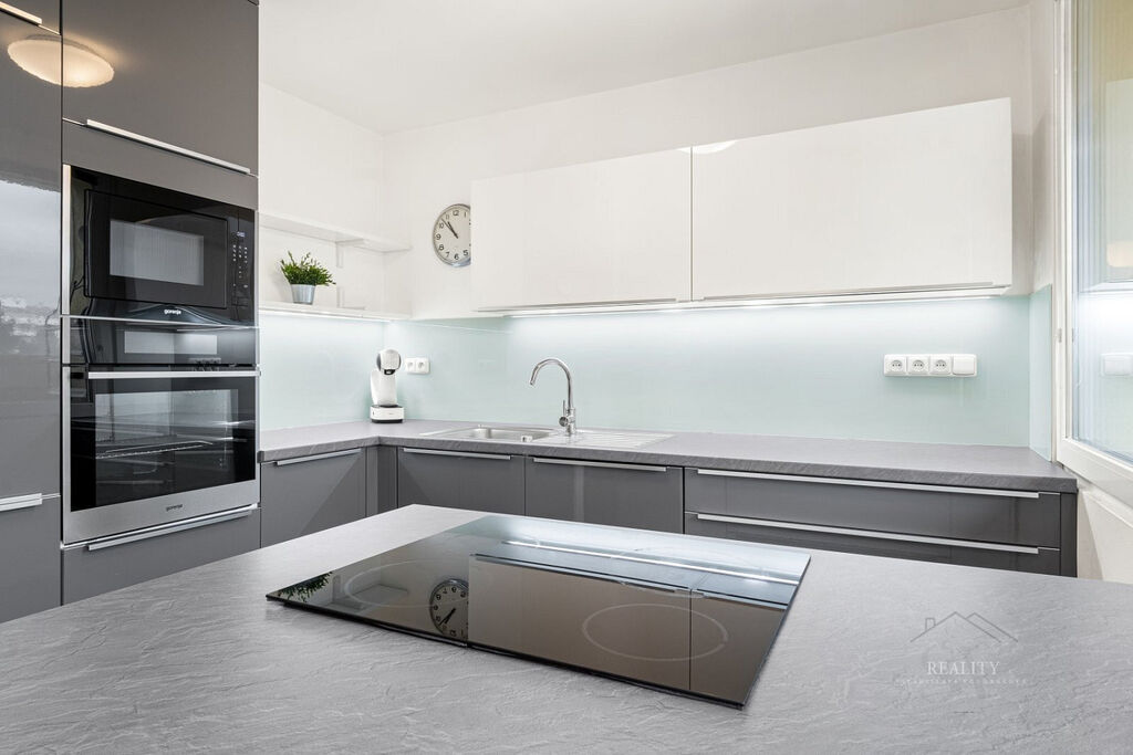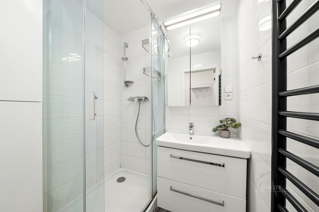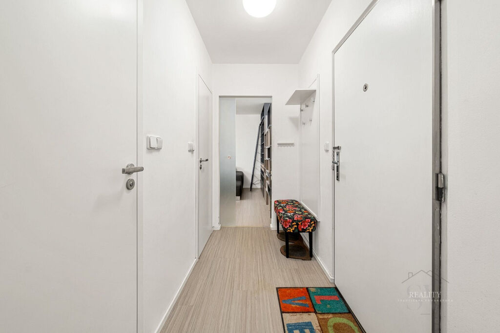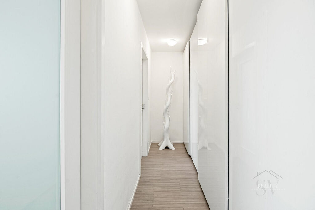 Interiér prošel precizní rekonstrukcí s důrazem na materiály a funkčnost. Samozřejmostí je kuchyň na míru s ostrůvkem, vestavěné spotřebiče, sklokeramická varná deska a komínový odsavač s možností barového sezení. Designová koupelna se sprchovým koutem, oddělené WC, nové rozvody a elektroinstalace, marmoleum na podlahách (odolné, tiché, snadno udržovatelné). Maximálně využitý úložný prostor: vestavné skříně v bílém lesku v chodbě (včetně botníku) a promyšlené prvky v koupelně; pračka skrytá v chodbové skříni + příprava na sušičku – interiér působí čistě a vzdušně.
