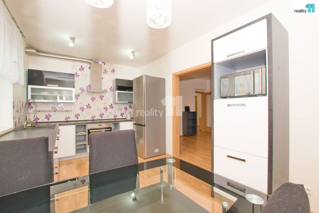Dispozice: prostorný obývací pokoj s balkonem, dvě samostatné ložnice, kuchyň s plně vybavenou linkou a spotřebiči, koupelna s vanou i sprchovým koutem, dvěma umyvadly, samostatná toaleta, šatna a vestavěné skříně na chodbě.