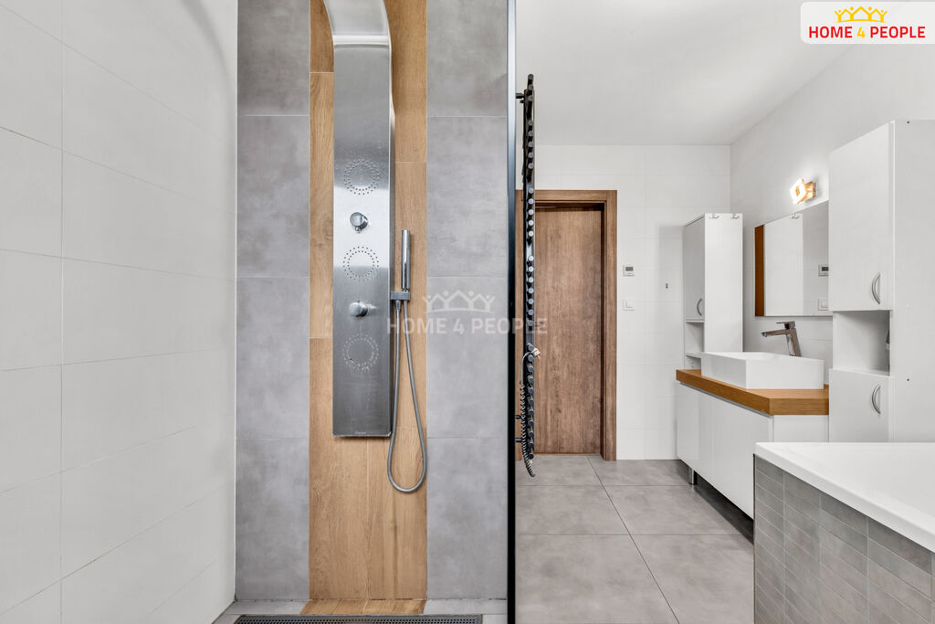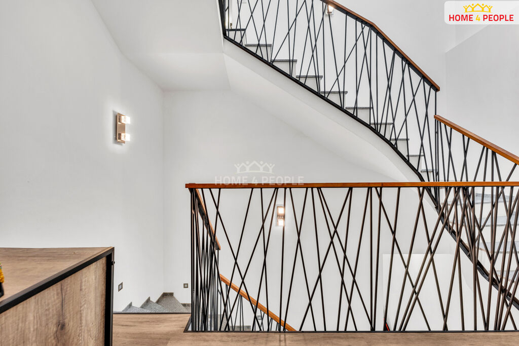 Jednotka je vytápěna úspornými uhlíkovými foliemi a zimní zahrada topnými kabely. V přízemí prostorná technická místnost, samostatné WC, velký obývací pokoj propojený se zahradou, moderní kuchyňský kout a praktický sklad pod schodištěm. Mramorové schodiště s designovým zábradlím. V 1. patře umístěna ložnice s vestavnými skříněmi pro uložení věcí a ve 2. patře jsou dva další pokoje - velká rodičovská ložnice a pokoj opět se skříněmi na míru s dostatkem úložného prostoru. Na společné chodbě samostatná toaleta a velká koupelna s vanou a sprchovým koutem. V oknech v přízemí a prvním patře venkovní žaluzie. Na podlaze je vinyl a mramor.