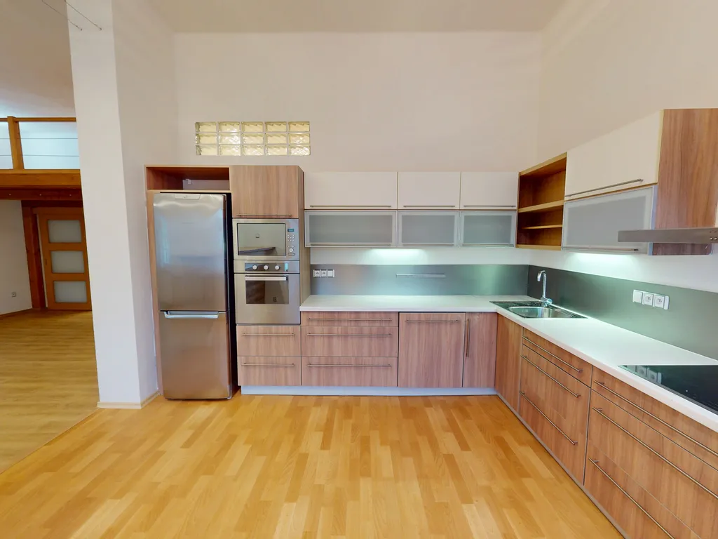 Byt je částečně vybavený. Kuchyňská linka je osazena moderními spotřebiči – lednicí, mikrovlnnou troubou, myčkou nádobí, elektrickou troubou, varnou deskou a digestoří.