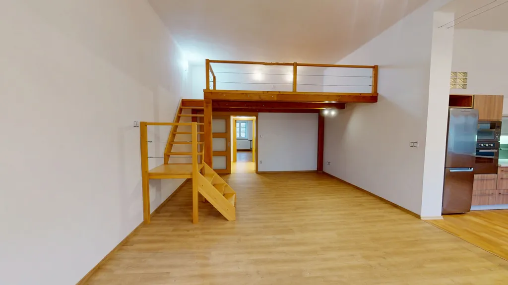 Součástí bytu je také vyvýšené místo pro spaní, které chytře odděluje obytný prostor a přináší útulné řešení pro odpočinek.