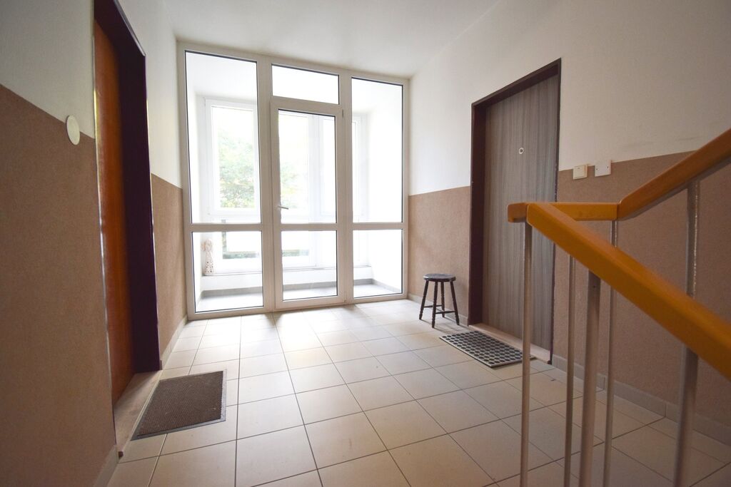 Byt se nachází v prvním patře, jedná se ovšem o druhé nadzemní podlaží. V prvním podlaží jsou společné prostory, jako je sušárna, kolárna, sklepy, apod.