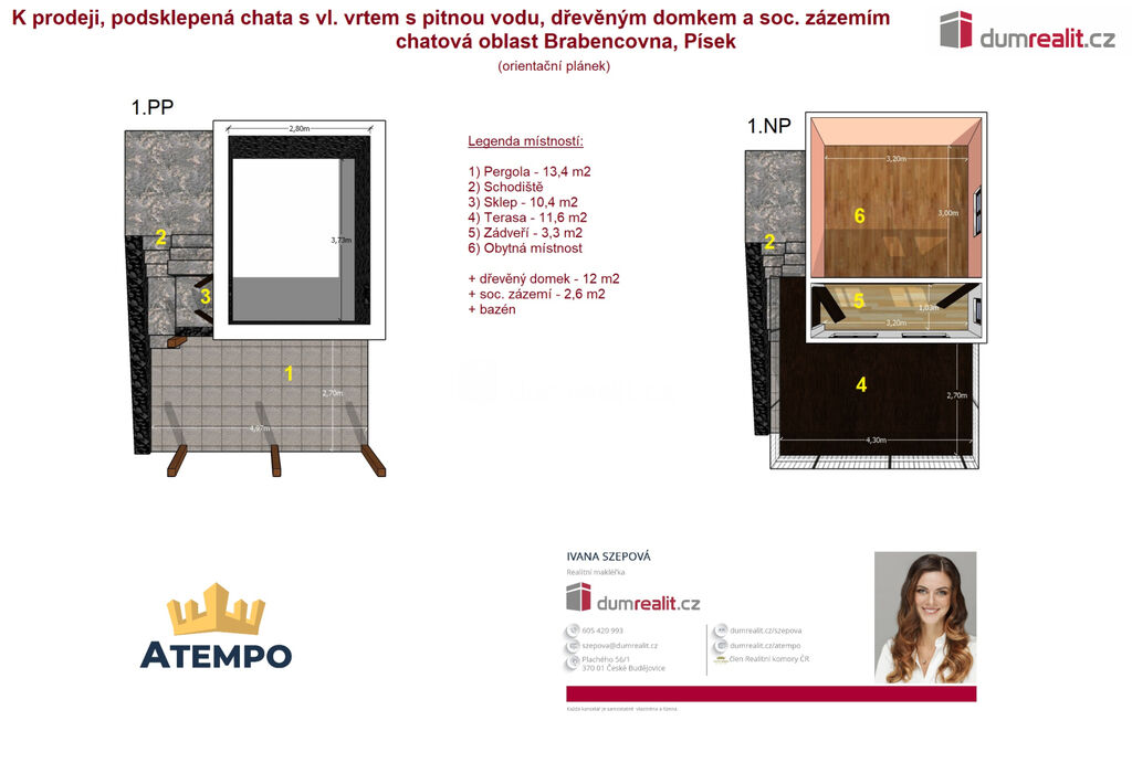 Dumrealit.cz Vám zprostředkuje prodej podsklepené chaty s terasou s výhledem na město, pergolou, vlastním vrtem s pitnou vodu, elektřinou a pozemkem o celkové výměře 335 m² na okraji klidné, uzavřené, oplocené a zamčené zahrádkářské kolonie Brabencovna, jen 5 minut od centra Písku. Součástí prodeje je pozemek parc.č. 1402/28 o výměře 335 m² a pozemk parc. č. st. 4473 o výměře 24 m², to vše je zapsané na LV č. 16160 v katastrálním území Písek. Na pozemku se nacházejí 2 dřevěné chaty: 1) obytná 3x4m; 2) se sociálním zázemím (chemické WC a sprcha s ohřevem vody). Součástí prodeje je také bazén. Objekt je připojen na elektřinu. Hloubka vrtu činí 27 metrů. Místo je ideální pro rekreaci a zahrádkářské využití s krásným výhledem na město Písek. Více informací poskytne realitní makléřka Ivana Szepová z realitní kanceláře A TEMPO fungující pod ochrannou známkou dumrealit.cz. Ev. číslo: 652877.