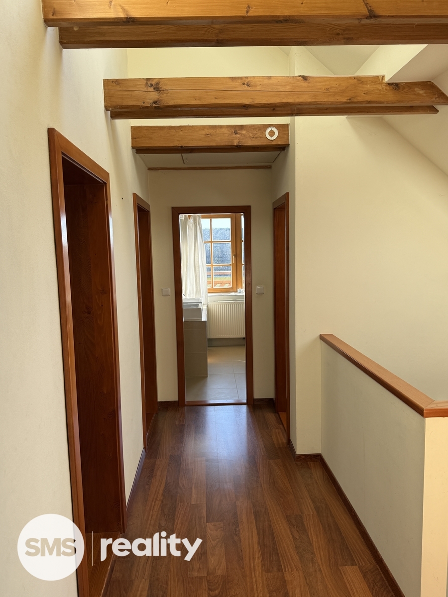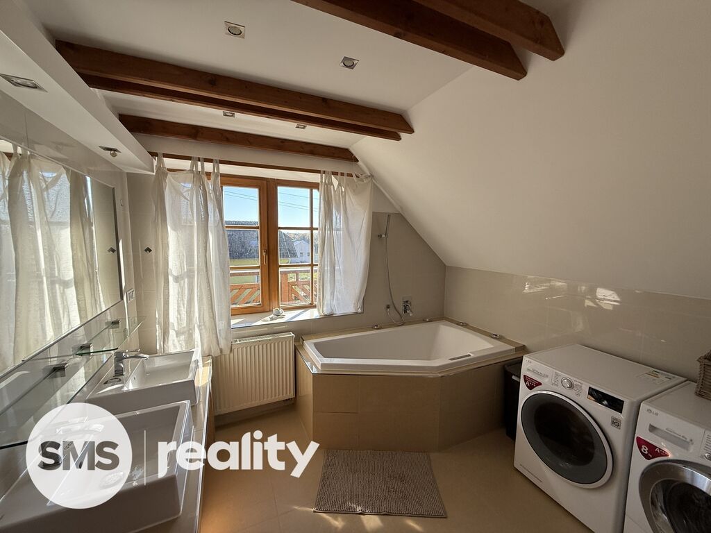 1. patro: chodba, tři samostatné pokoje (jeden s balkonem), koupelna s vanou, dvěma umyvadly, bidetem, pračkou a sušičkou, samostatné WC.