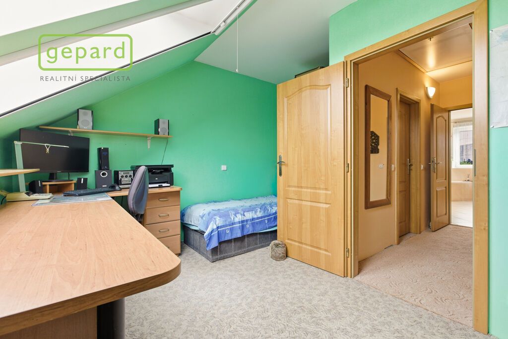 V patře jsou tři samostatné místnosti a velmi prostorná koupelna s vanou, sprchovým koutem, WC i bidetem. Z koupelny vede další místnost, která slouží, jako technické zázemí (pračka, sušička ap.). Dále se v patře nachází další úložná komora s výlezem na půdu.