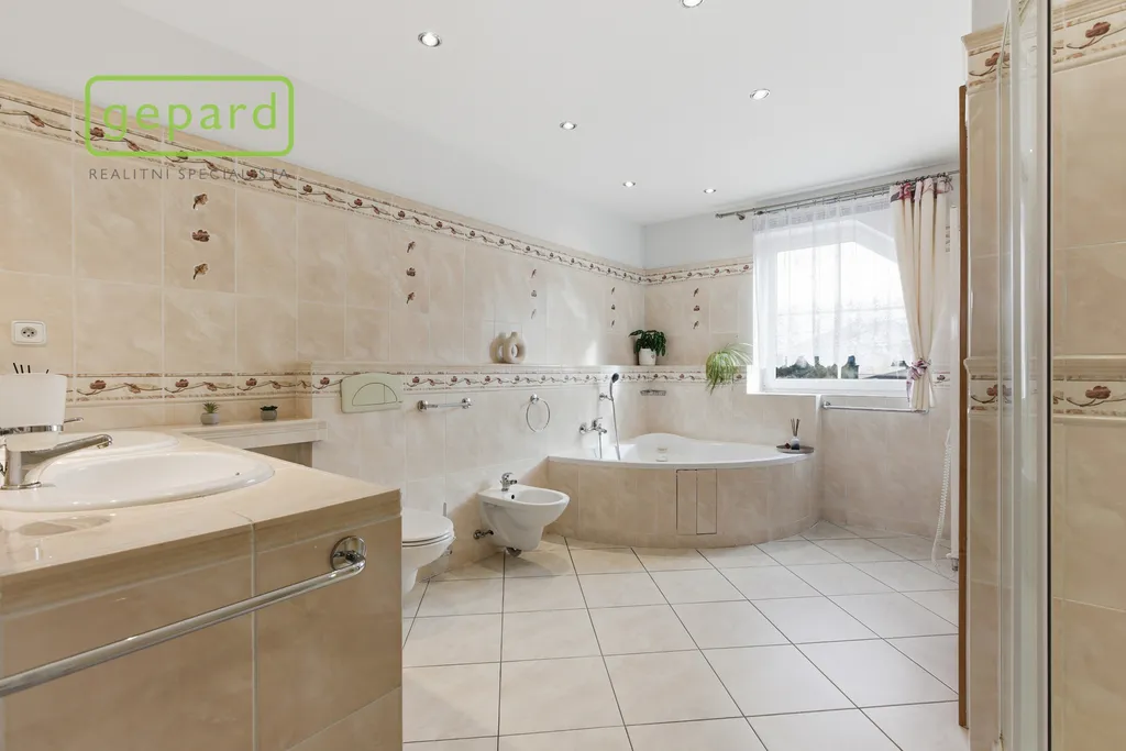 Nechybí zde ani praktické prvky jako komora, spíž, samostatné WC a vstup do garáže přímo z domu. V patře najdete tři samostatné pokoje, velkou koupelnu s vanou, sprchovým koutem, WC a bidetem, technickou místnost (např. pro pračku a sušičku) i další úložný prostor s výlezem na půdu.