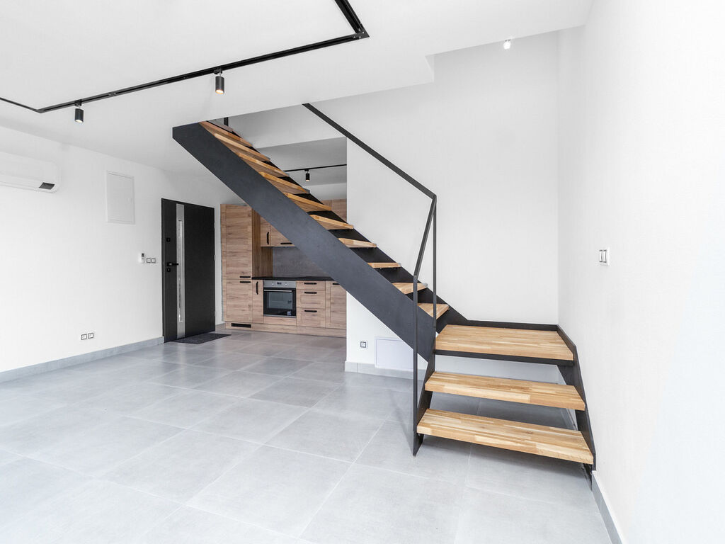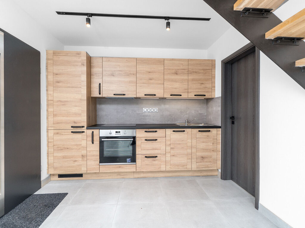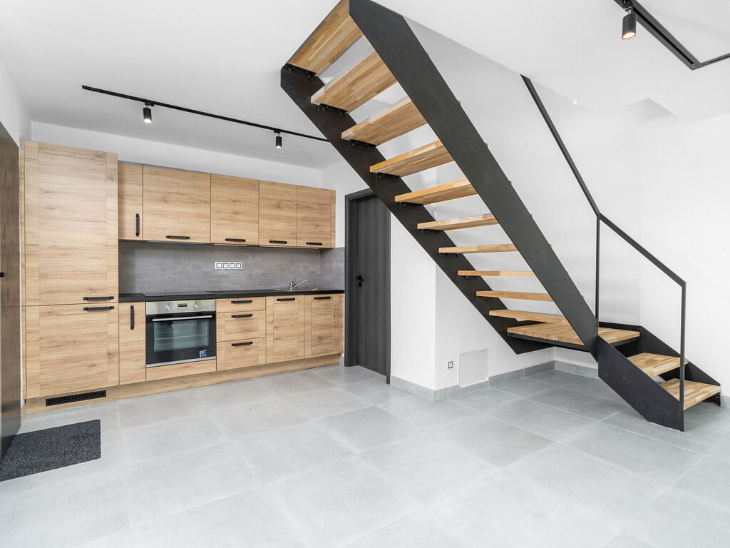 Přízemí: světlý, otevřený prostor s kuchyňským koutem a obývací částí, moderní koupelna