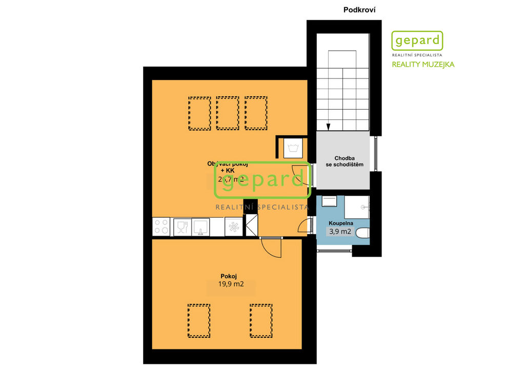Podkrovní byt je umístěný ve 2.patře a je tvořen zádveřím, koupelnou se sprchou a WC, obývacím pokojem s kuchyňským koutem a ložnicí. Je vybaven kuchyňskou linkou se spotřebiči (indukční varná deska, horkovzdušná elektrická trouba, digestoř, mikrovlnná trouba, lednice s mrazákem, myčka) a pračkou. Vytápění stropními infrapanely, v koupelně je elektrický žebřík, ohřev vody elektrickým boilerem. Byt bude připravený k nastěhování od prosince.