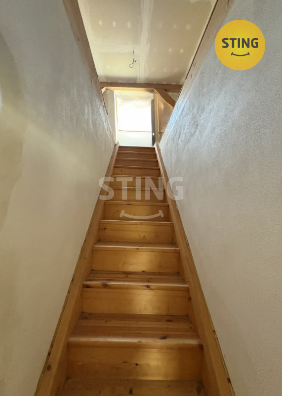 V podkroví, kde je potřeba dokončit drobné úpravy, se nacházejí dvě ložnice a druhá koupelna se sprchovým koutem a WC. Nemovitost je napojena na vodu elektřinu a septik. Topení je ústřední napojené na úsporný elektrokotel.