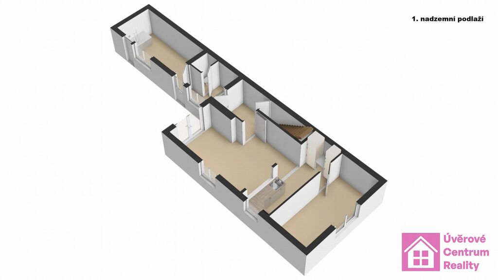 1 NP: koupelna, chodba, toaleta, chodba, pokoj s kuch. koutem a pokoj